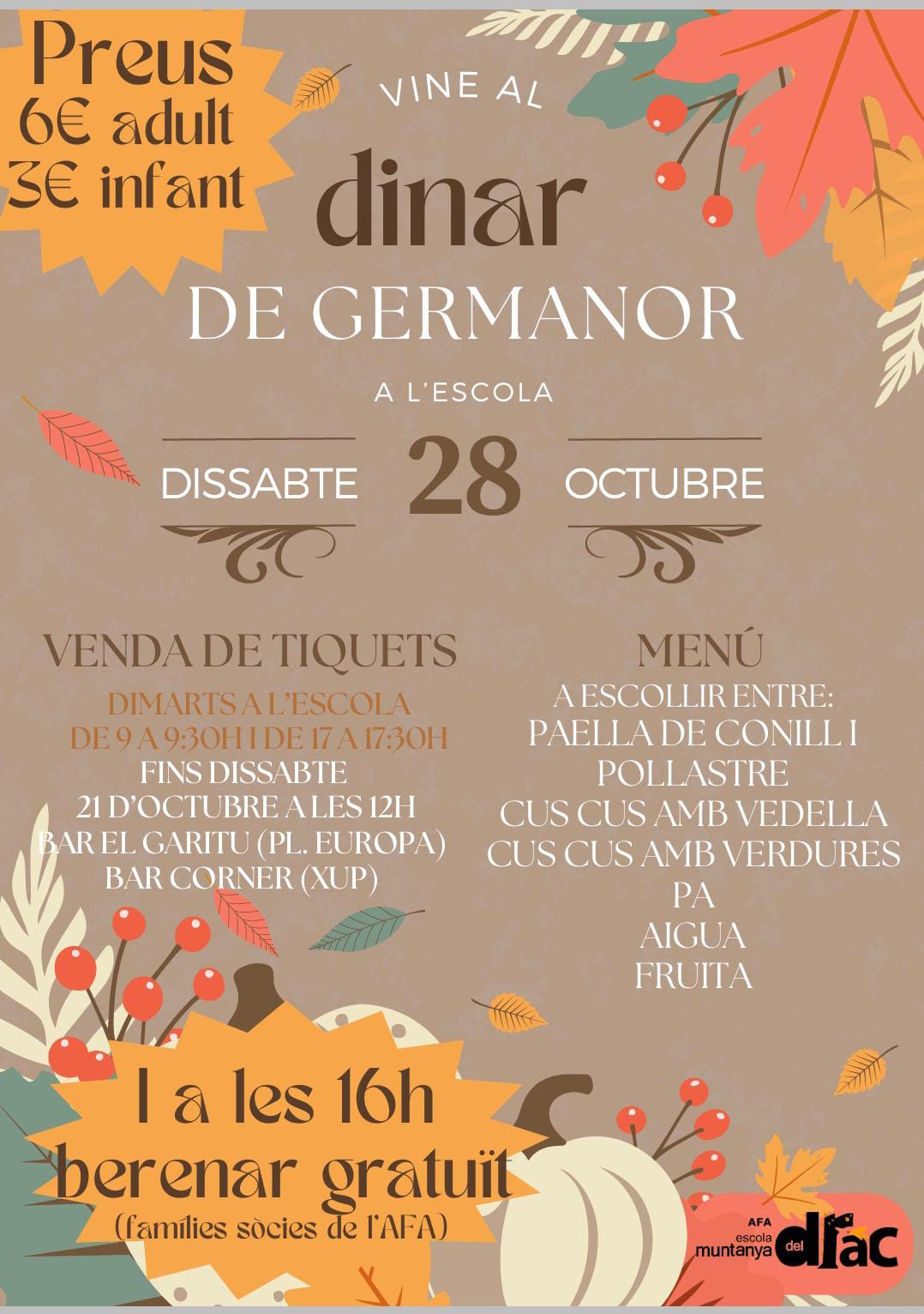 El proper dissabte 28 d’Octubre celebrarem el primer dinar de Germanor organitzat per l’AFA. En aquest dinar ens podrem coneixer tots millor i gaudir d’una bona estona tan infants com adults. Us deixem el cartell informatiu.