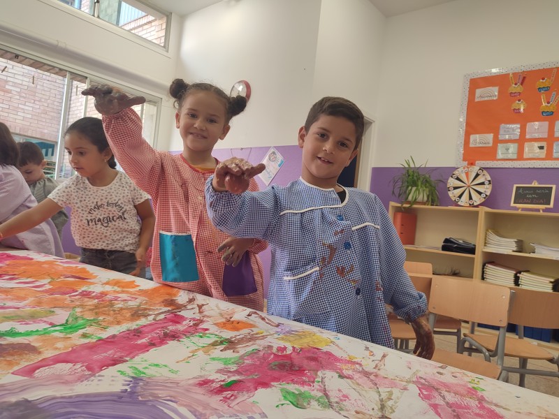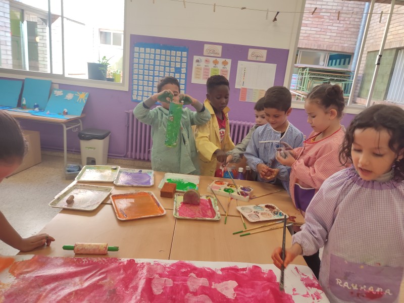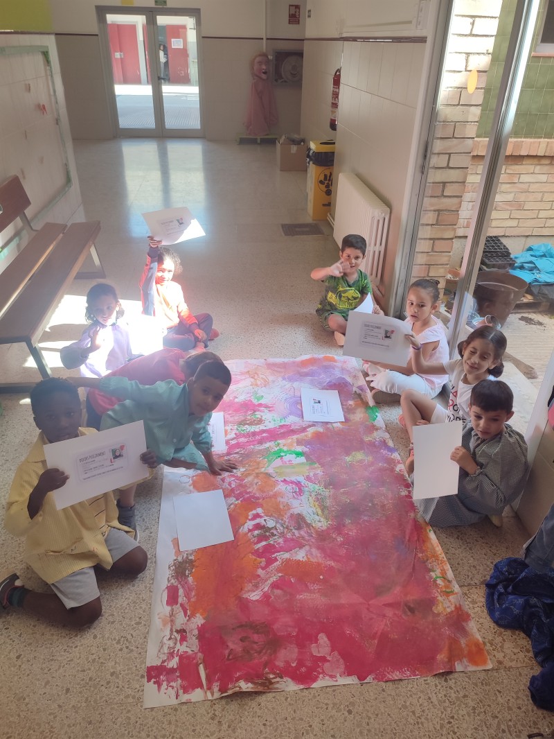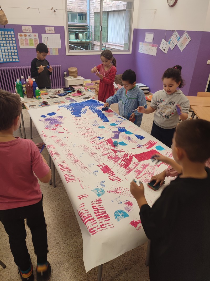 A la primera sessió del taller visualitzem dos vídeos per conèixer l’artista i poder veure moltes de les seves obres. Tot seguit, amb pintura, plasmem diferents textures sobre paper de manera col·lectiva.