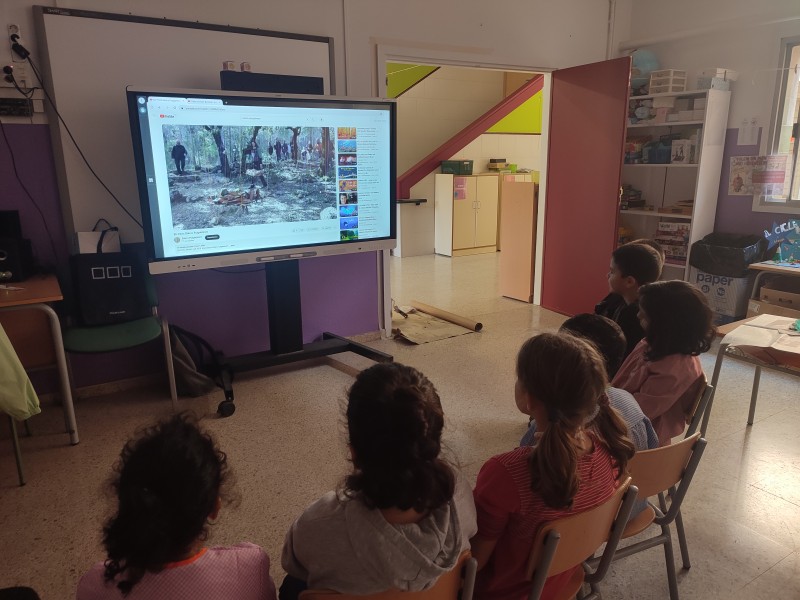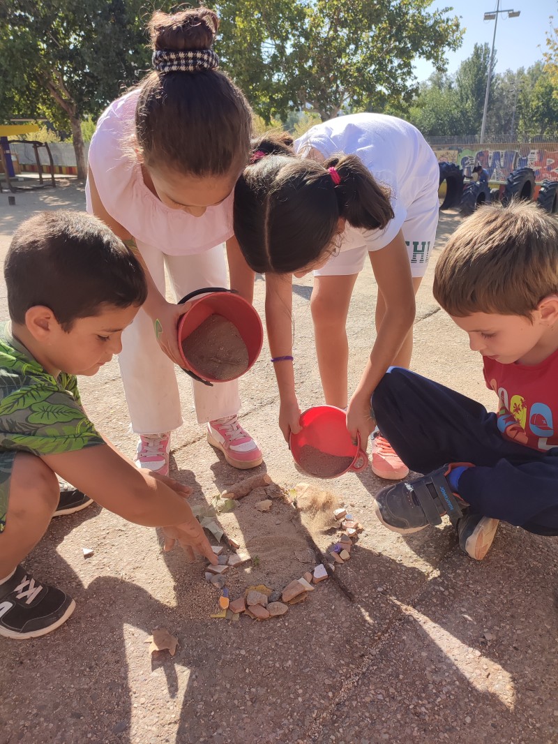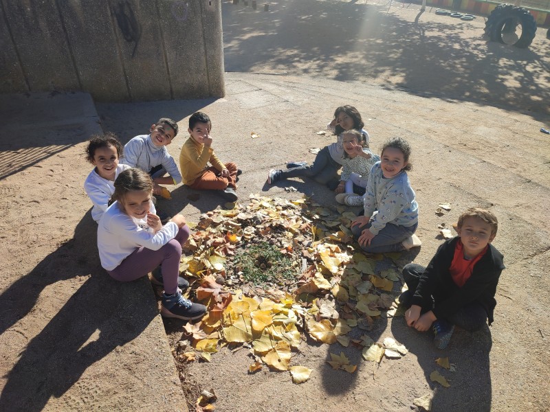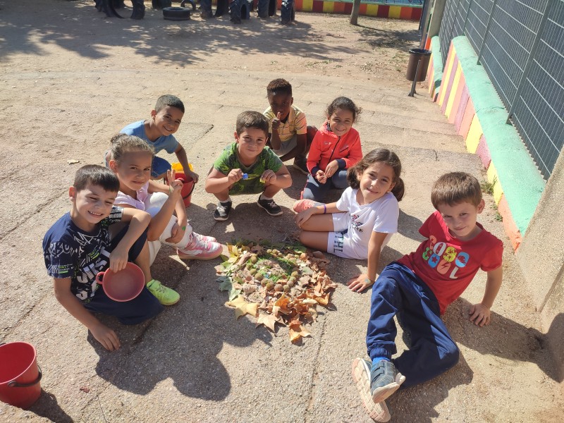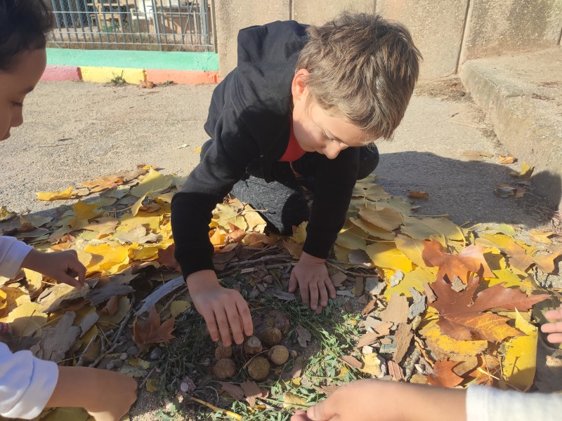 A la segona sessió fem land art. Sortim al pati i amb tots els elements que trobem de la natura fem una composició.