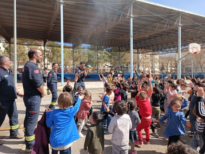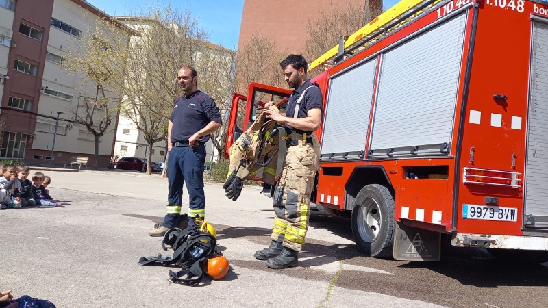 Aquesta setmana vam tenir una gran sorpresa, dilluns ens van venir a visitar els bombers al barri, vam conèixer-los, ens van explicar la seva feina i ens van ensenyar la seva vestimenta i el camió.