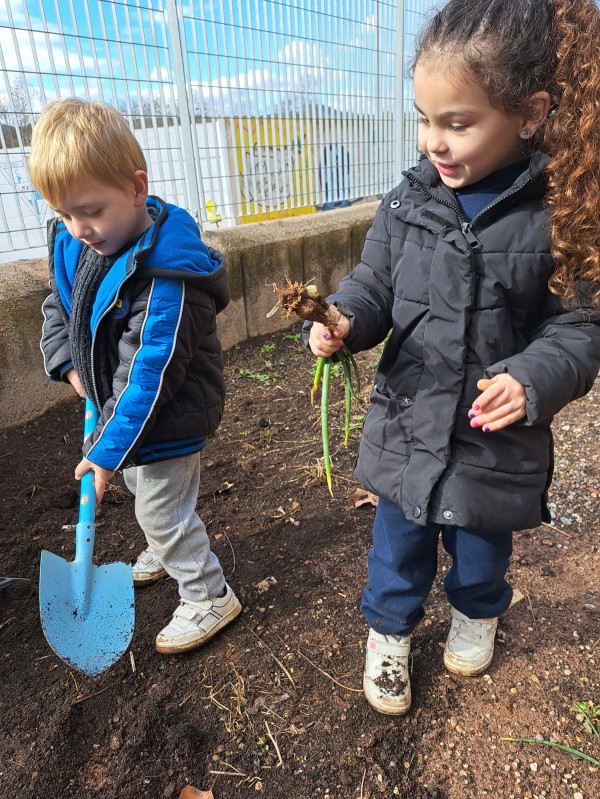 Amb les pales, les aixades,i els rasclets hem remogut la terra.Hi hem rascat les herbes dolentes, i arrancat força herbes.Ha quedat l’espai ben net per poder plantar ben aviat .