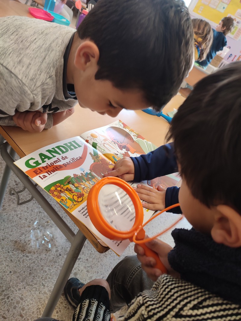 A la tarda vam llegir a la Petit Sàpiens la història de Gandhi i vam fer un mural amb una frase seva.