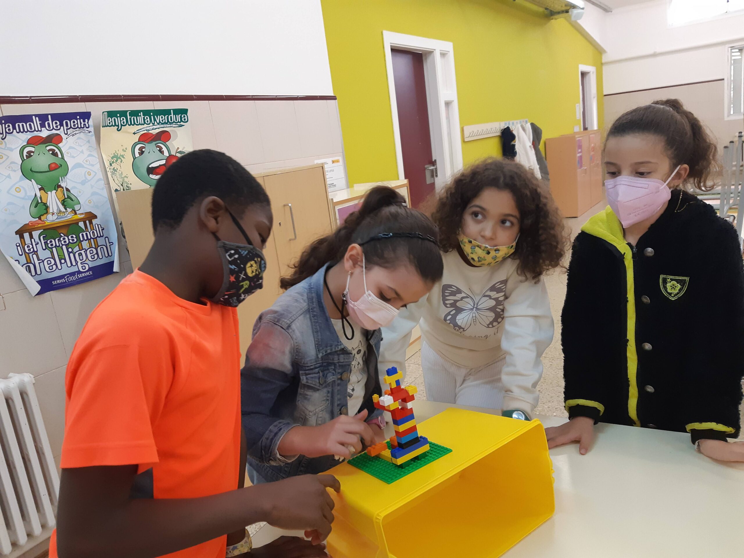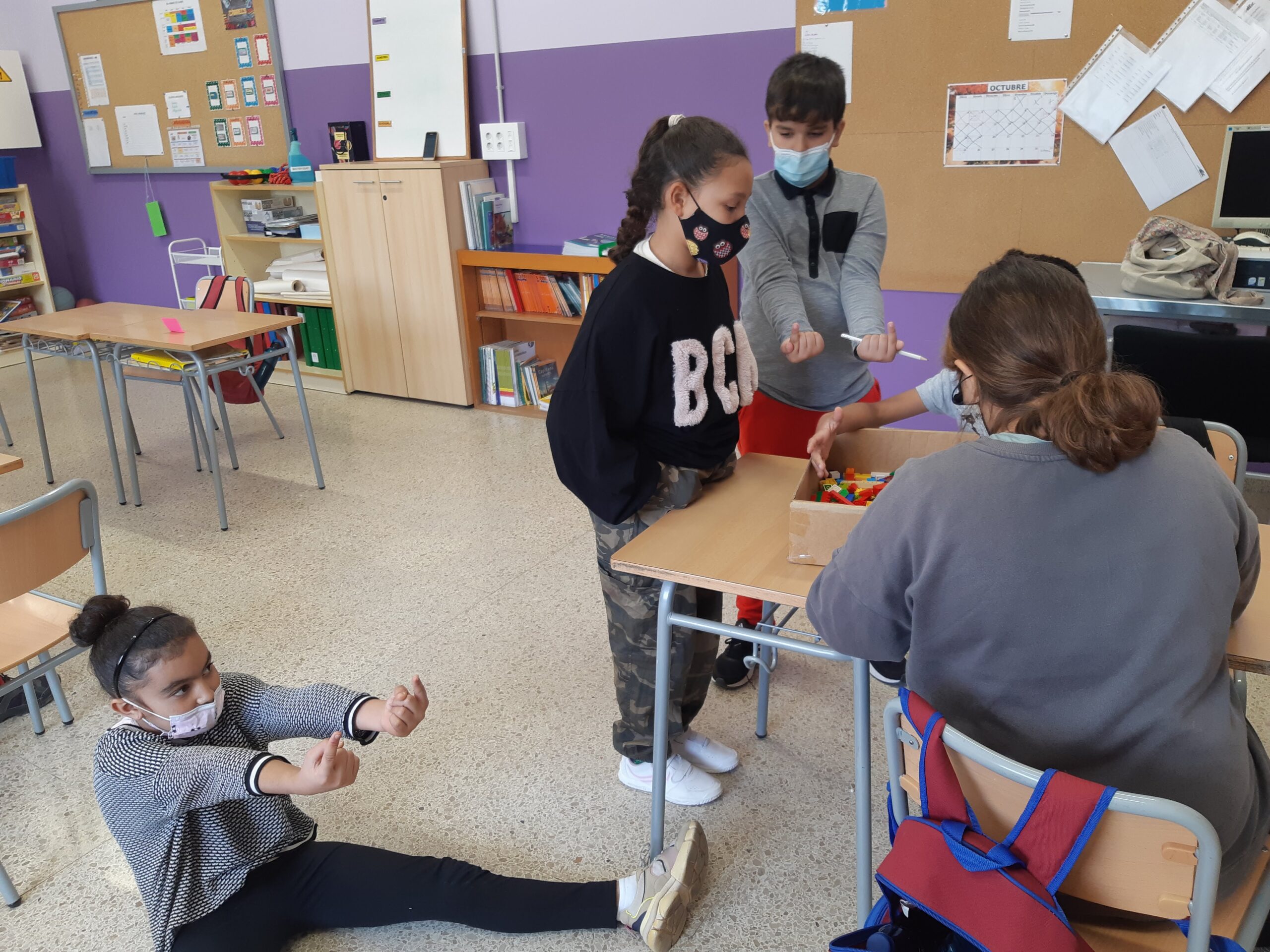 els auditius es van quedar a dins ,amb un full per dibuixar, i els tàctils, en un altre espai de la classe, amb peces Lego.