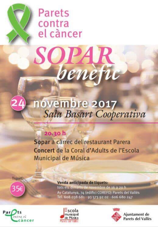 Com ja és tradició, el sopar benèfic organitzat per l’entitat local “Parets contra el càncer” comptarà amb la col·laboració de la coral d’adults de la nostra escola que oferirà un concert amb el millor del seu repertori. L’acte tindrà lloc el divendres 24 de novembre a la sala Basat de Parets a les 20.30h