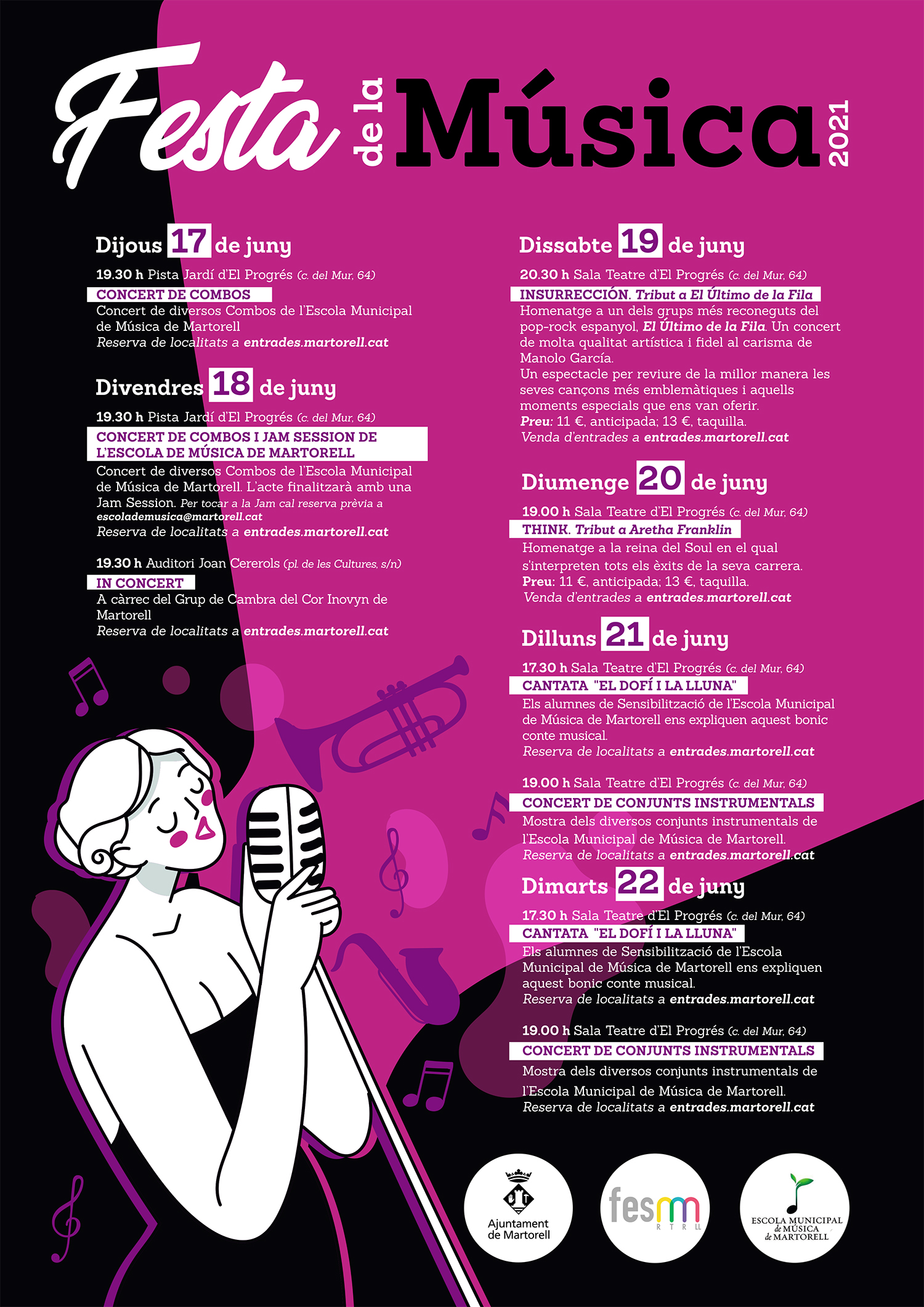 La Regidoria de Cultura de l’Ajuntament de Martorell organitza per primer cop la Festa de la Música entre el 17 i el 22 de juny. Es tracta d’una programació de nou actes, entre els que destaquen els dos concerts tribut, que es dedicaran a la formació El último de la fila i a la cantant Aretha Franklin. Hi ha els recitals de final de curs dels diferents grups de l’Escola Municipal de Música, així com un concert de la Coral Inovyn a l’Auditori Joan Cererols del Centre Cultural.