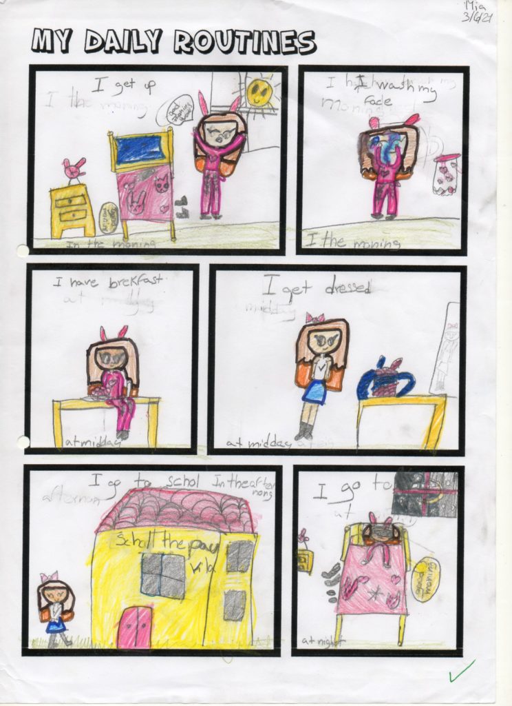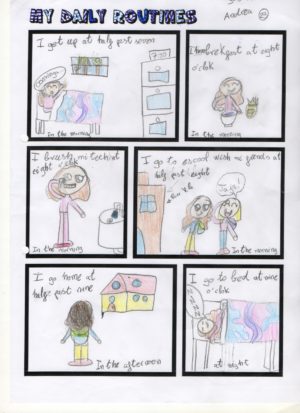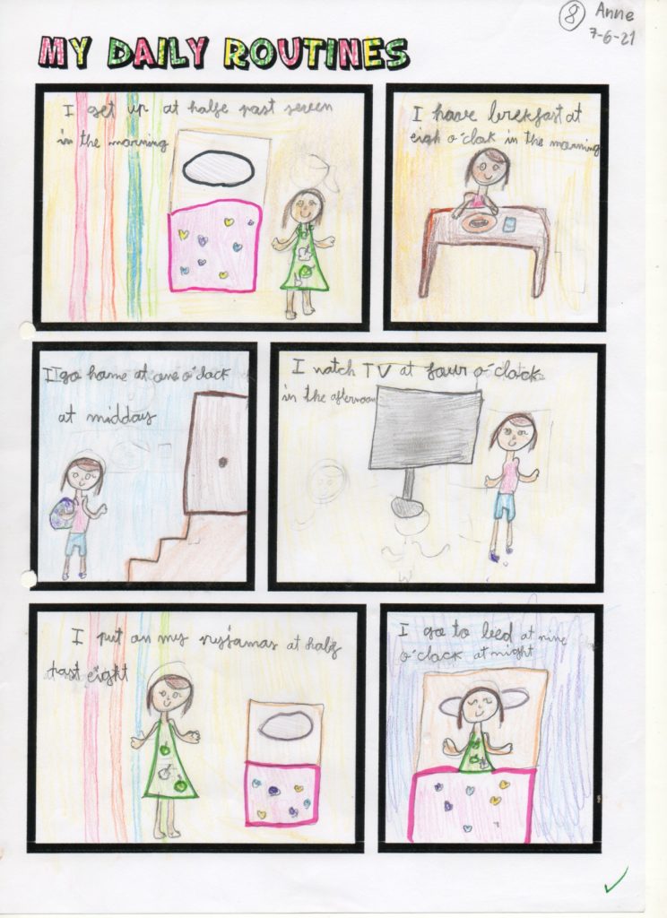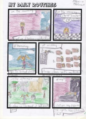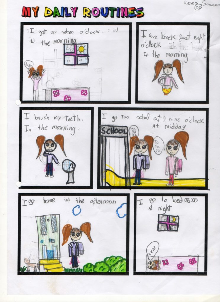 Aquest curs els alumnes de 3r hem creat un còmic sobre les rutines del dia a dia en Anglès, que és el que hem estat treballant com a l’últim tema del curs. Durant les últimes classes hem après com es diuen algunes de les activitats que fem durant el dia ( I get up, I have breakfast,…) i com que també hem estat estudiant les hores en anglès i hem afegit les hores en què les fem ( I get up at seven o’clock, I have breakfast at half past seven …). La tasca demanada era dissenyar individualment el còmic. Primerament cada alumne ha pensat les coses que fa durant el dia i aleshores ha creat un còmic amb algunes de les activitats que fem. El resultat final han estat uns còmics molt vistosos i atractius. A continuació podeu veure una representació de les feines que hem fet. Han fet molt bona feina, així que els felicitem a tots i totes!