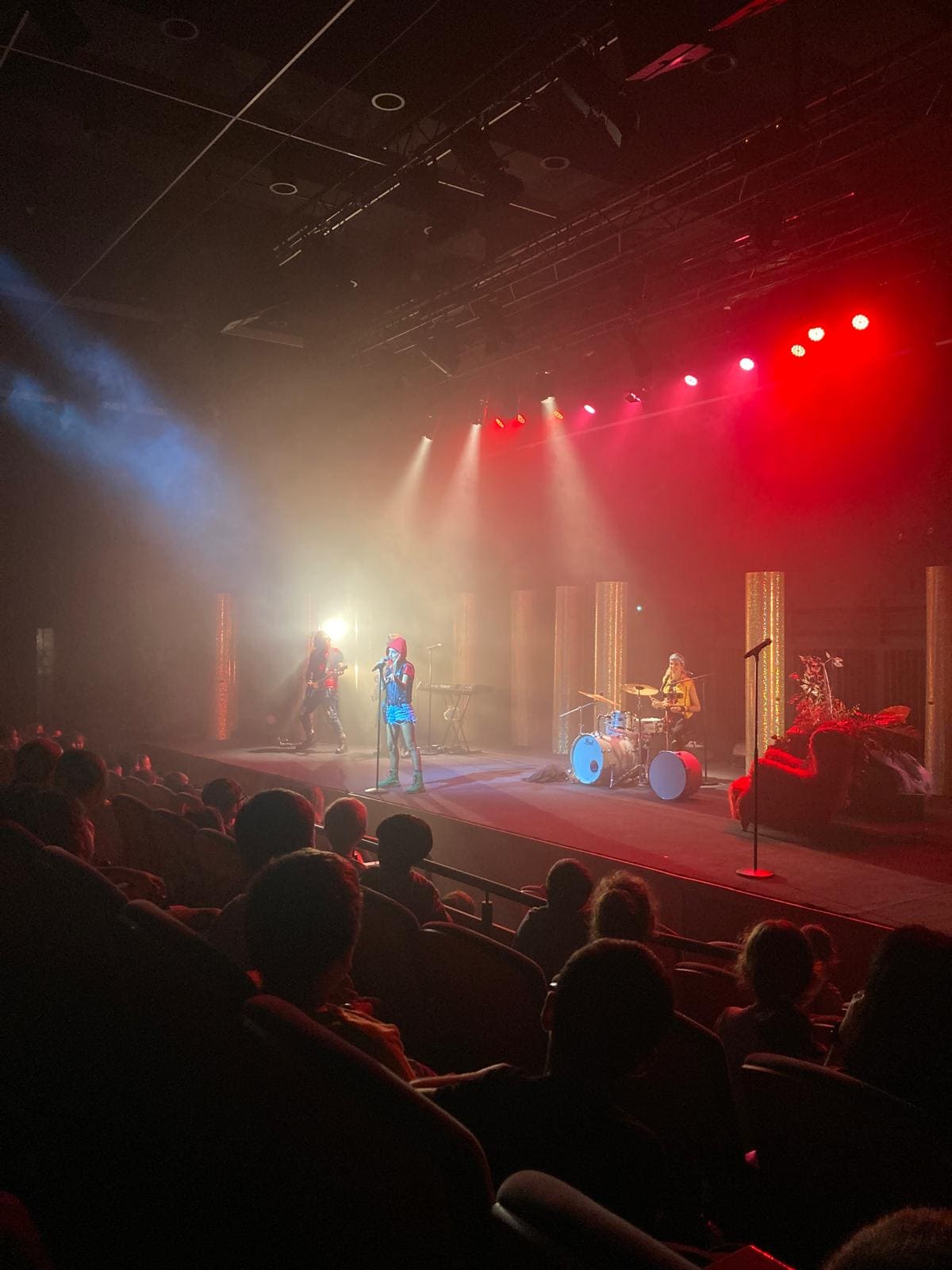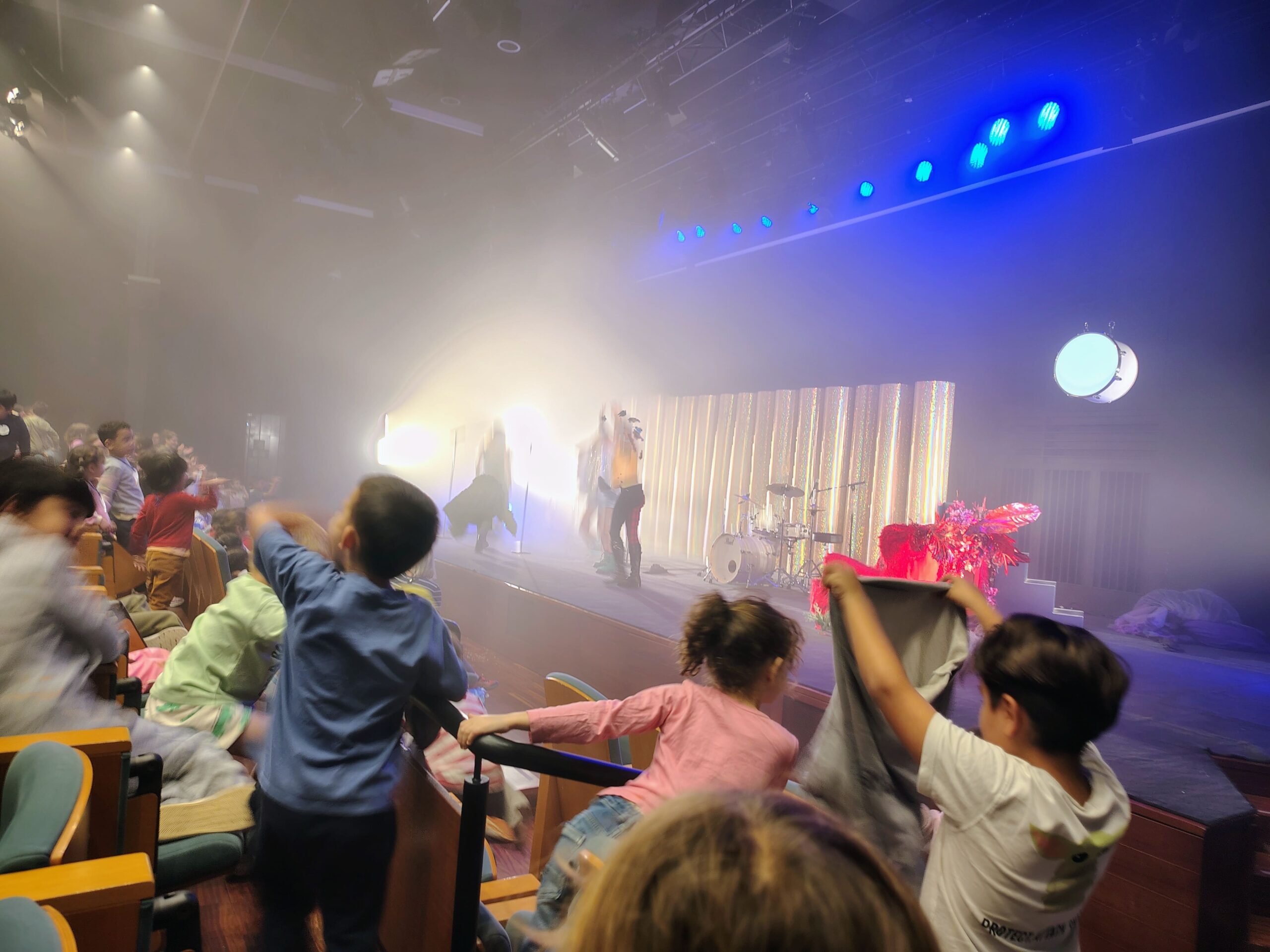 Els músics van fer vibrar l’escenari amb guitarres elèctriques, bateria i veus potents que van fer moure tothom al ritme del rock. Els nens i nenes van seguir el concert amb entusiasme, aplaudint, rient i deixant-se portar per la música.