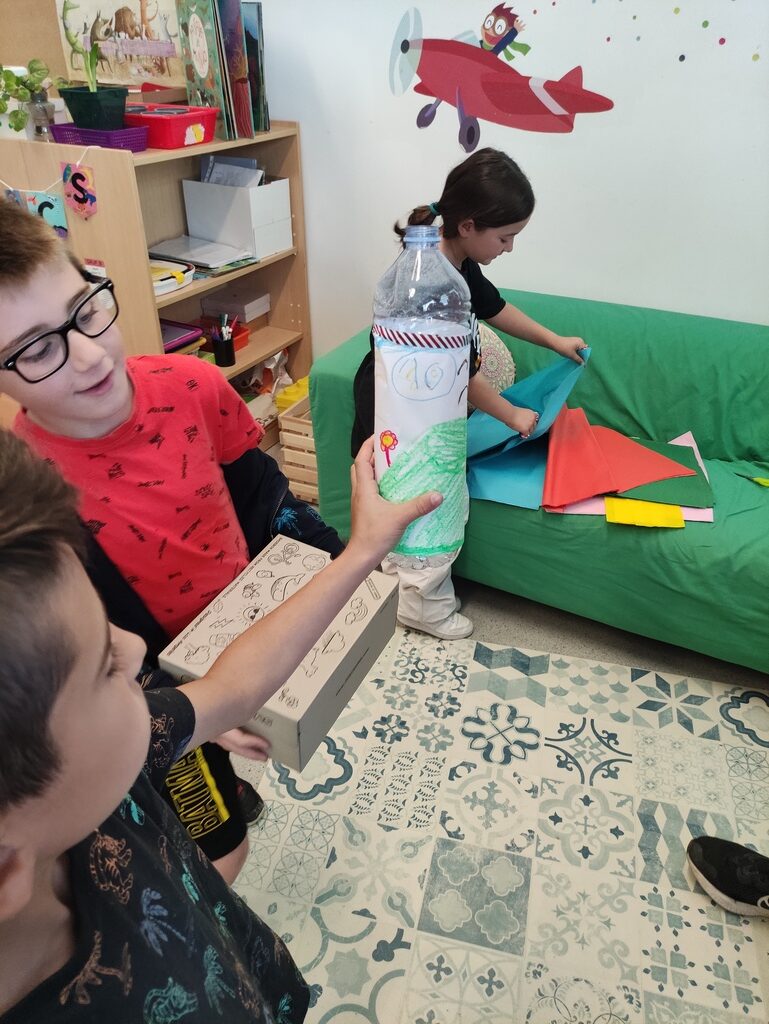 Finalment, aprofitant les ganes de jugar dels nens i nenes i per fer un tancament divertit de què hem estat aprenent, hem fet una recollida dels residus reciclables que han anat generant les famílies i mestres a casa (ampolles, rotlles de paper, taps, oueres…) per elaborar les nostres pròpies joguines.
