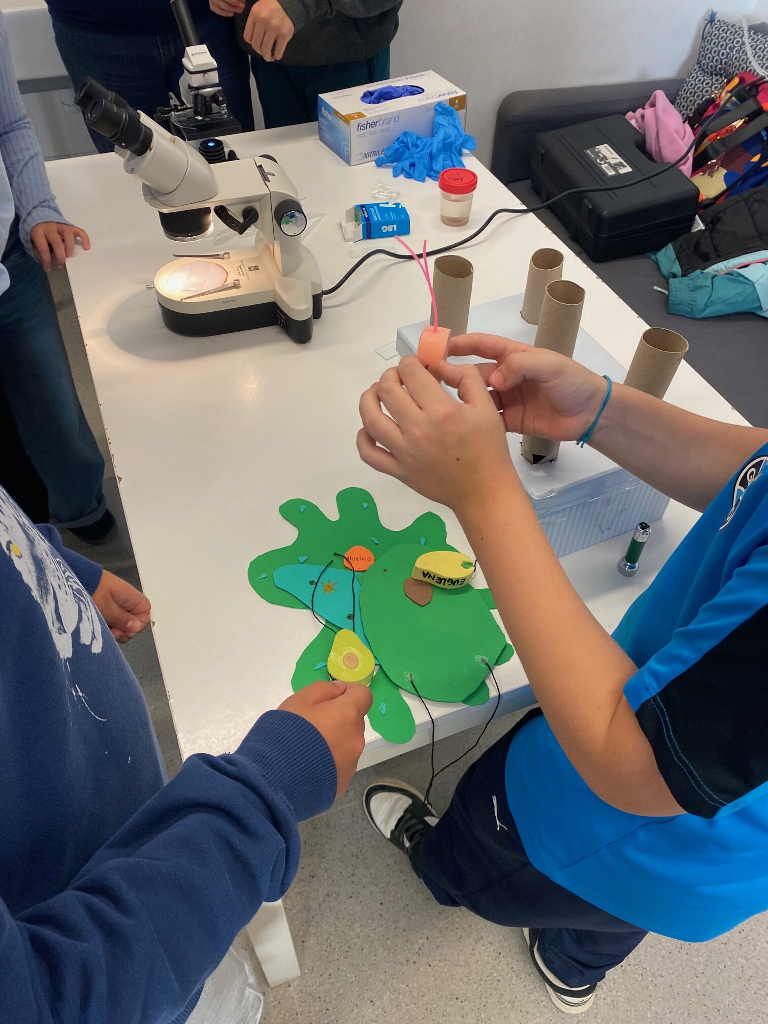 A més, vam fer altres activitats com identificar les diferències entre els diversos protozous a través d’unes maquetes. Així, vam aprendre que alguns tenen una espècie de peus (pseudòpodes), pèls (cilis) o cues (flagel). També, amb un slime, vam poder simular manipulativament com era la reproducció (en forma de divisió i generant un progenitor idèntic).
