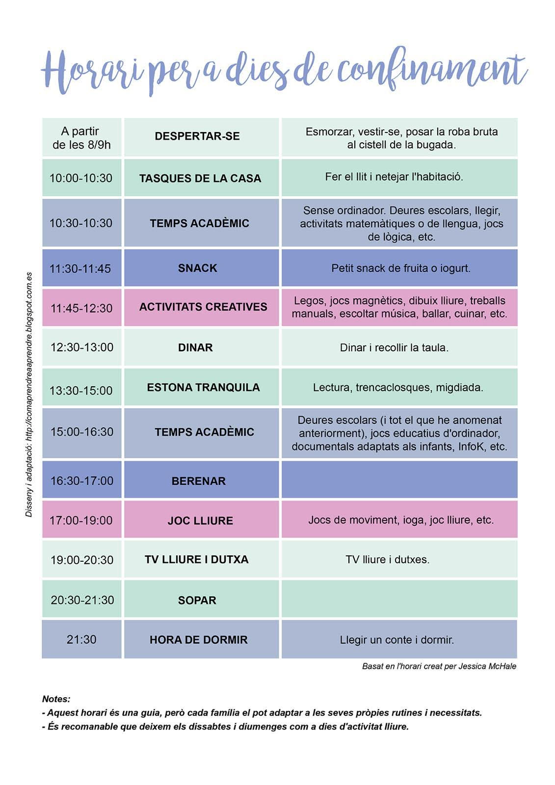 • Si encara no el teniu, us recomanem que us pugueu fer un horari amb els vostres pares i mares decidint i repartint les estones de feina, de descans, de joc, lliures, de col·laborar amb les feines de casa,…