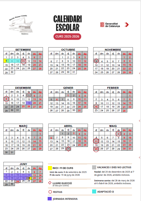 Especialment, aquest curs hi haurà un període de jornada intensiva, del dia 8 al 19 de juny de 2026. Durant aquest temps l’activitat educativa serà des de les des de les 9:00 h a les 13:00 h. Puntualment, el darrer dia del primer trimestre, el dia 19 de desembre de 2025, també hi haurà jornada intensiva