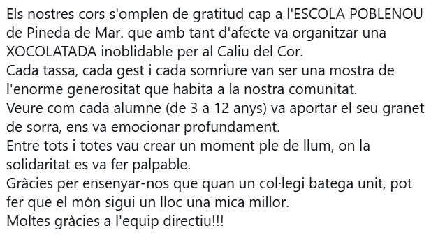 També aprofitem per fer una xocolatada solidària. Gràcies a l’empresa Vadelleure que ens regala els melindros i la xocolata.