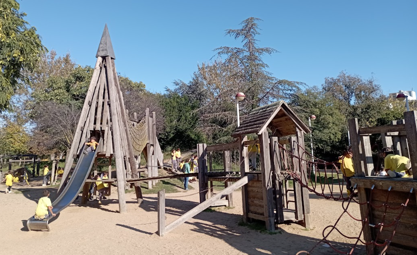 Quan vam arribar al parc, tothom es va escampar cap als seus jocs preferits. Els més valents van anar directe als gronxadors gegants, mentre que d’altres van optar pel tobogan serpentejant, que feia riure només de mirar-lo. També hi havia un circuit d’equilibri musical i més d’un es va sentir com un autèntic aventurer travessant ponts i plataformes. Després estan els addictes de la pilota i el futbol. Aquests no perden ocasió de barallar-se en una pista que fins i tot té porteries. Sempre es fa imprescindible la figura de l’àrbitre o d’un mestre que deixi clares les normes del joc. Si és així, hores i hores perseguint una esfera per xutar-la amb els peus…