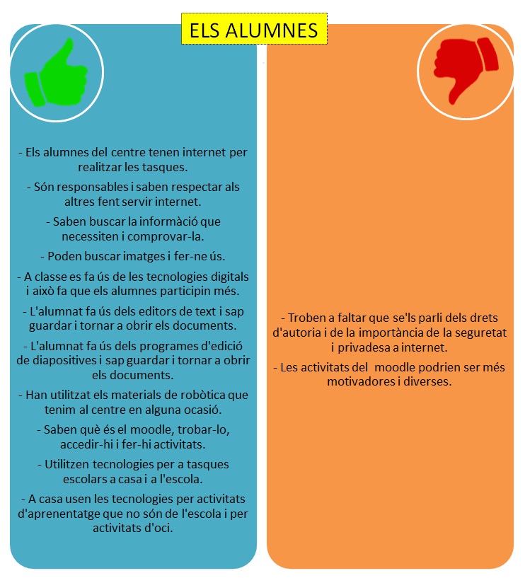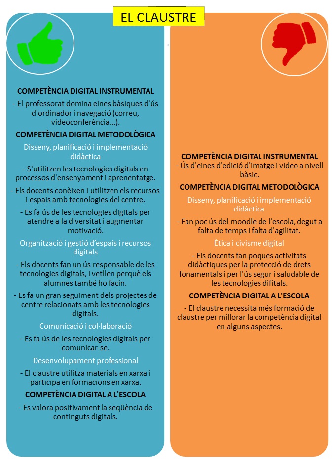 Analitzant els resultats, hem extret punts forts i febles de cada col·lectiu per tal de preveure el punt de partida de l’escola a l’hora d’elaborar l’Estratègia Digital de Centre (EDC).