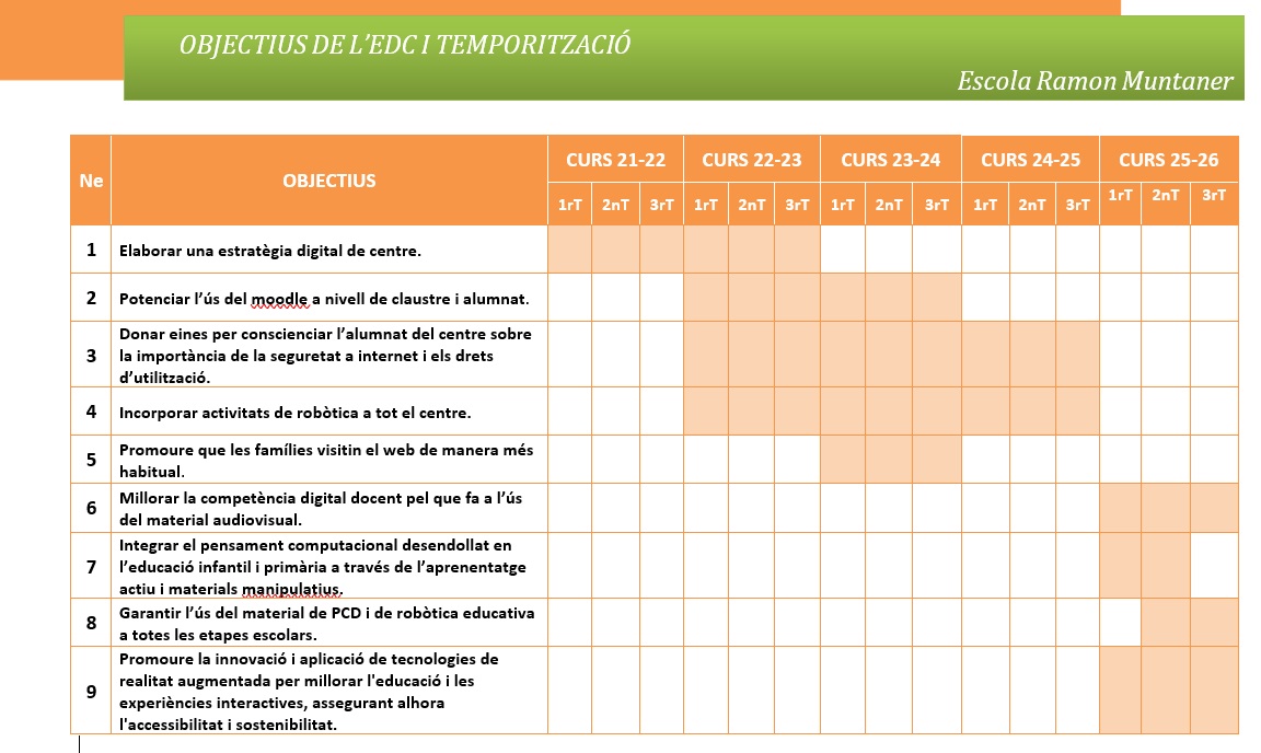 Agafant com a base la diagnosi realitzada amb famílies, alumnat i professorat i tenint en compte les necessitats del centre, hem elaborat un seguit d’objectius que inclourem en la nostra EDC i que hem temporitzat de la següent manera: