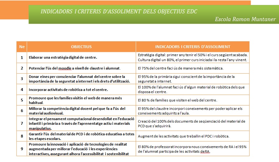 1.3 Planificació i seguiment Com a primer pas, hem establert els indicadors i criteris d’assoliment dels objectius que hem determinat a la nostra EDC, els quals detallem a continuació: 1.3.1 PLANIFICACIÓ DE CADA OBJECTIU
