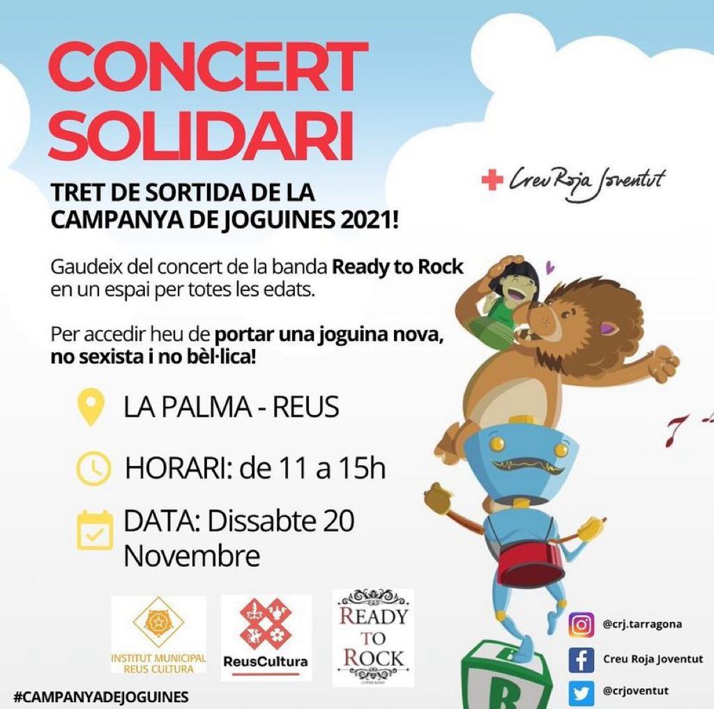 Amb la voluntat que cap nen@ es quedi sense joguina aquest Nadal, Creu Roja Joventut organitza aquest dissabte 20 de novembre d’11.00h a 15.00h, un concert per a totes les edats amb la banda Ready to Rock a La Palma (C/ Ample, 75 Reus).