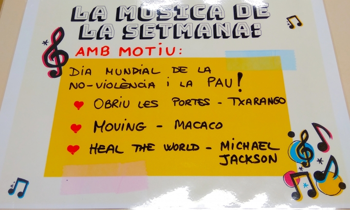 Benvolgudes famílies, a partir d’avui dilluns 27 de gener, la música que posarem cada setmana tindrà un motiu. Aquesta setmana les cançons fan referència a la No-violència i la Pau. El cartell estarà penjat a la cartellera del centre.