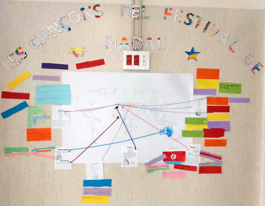 Les cançons que vam cantar pel Festival de Nadal, no només les hem après a cantar, no! Cada curs hem fet un petit projecte d’investigació del país d’on provenia la nostra cançó. Després, hem completat un mapa mundi gegant a l’entrada: amb les cançons unides amb el seu país d’origen i diferents informacions curioses que hem anat trobant.