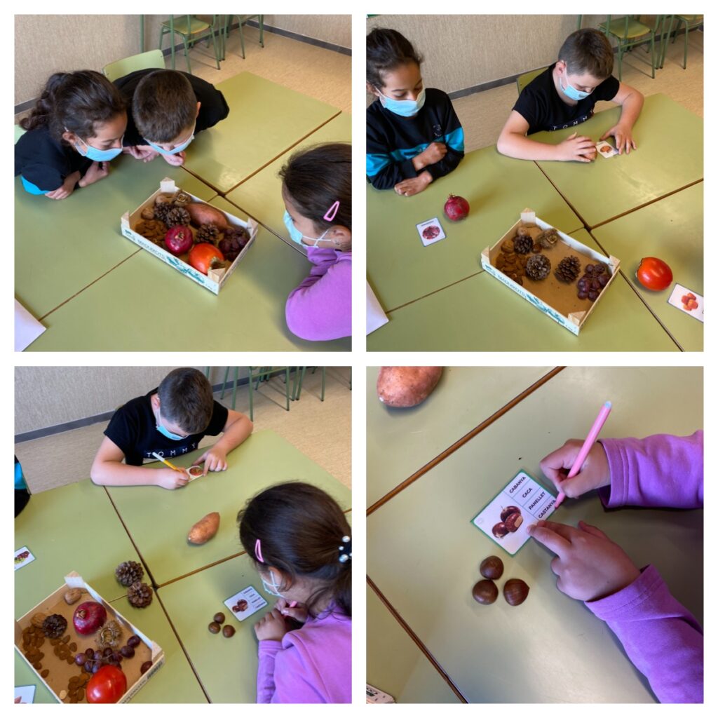 Fa uns dies l’alumnat de l’aula d’acollida vam observar que el temps havia canviat i que a les botigues apareixien uns aliments que fins ara no hi eren, la raó és que la tardor havia arribat! Hem estat treballant el vocabulari i fins i tot hem pogut tocar el caqui, les castanyes amb el seu embolcall de punxes, el raïm, les nous… Ha sigut una experiència molt divertida!