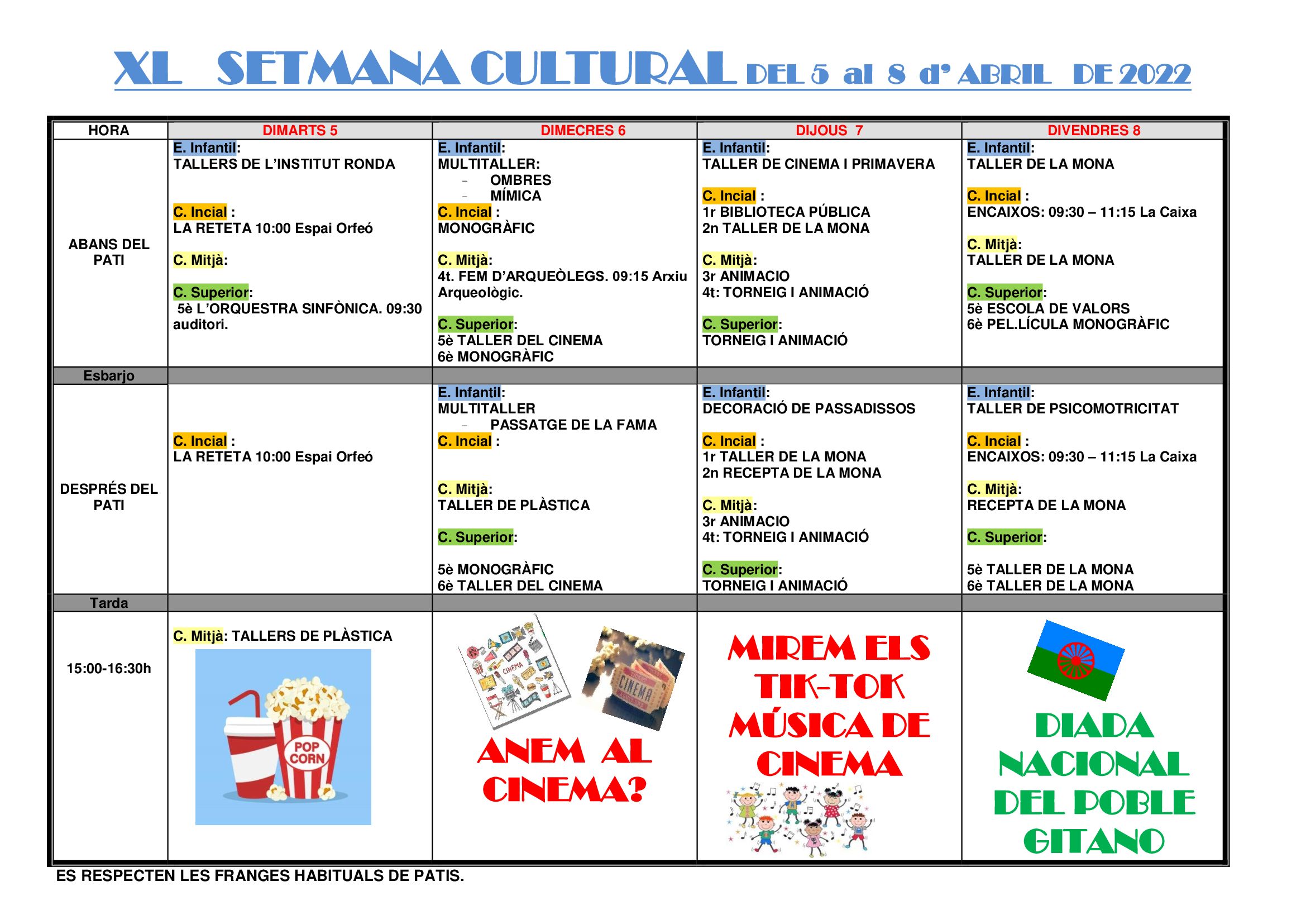 XL Setmana Cultural Feu un comentari / Per coordinació TAC / 5 d'abril de 2022 / 1r 1r Cicle 2n 2n Cicle 3r 3r Cicle 4t 5è 6è Educació Infantil Educació Primària I3 I4 I5 Portada Avui donem inici a la XL Setmana Cultural de l’Escola. Aquest any ens centrem en el monogràfic del cinema. A continuació, us detallem les diferents activitats que realitzarem en els diferents cicles.