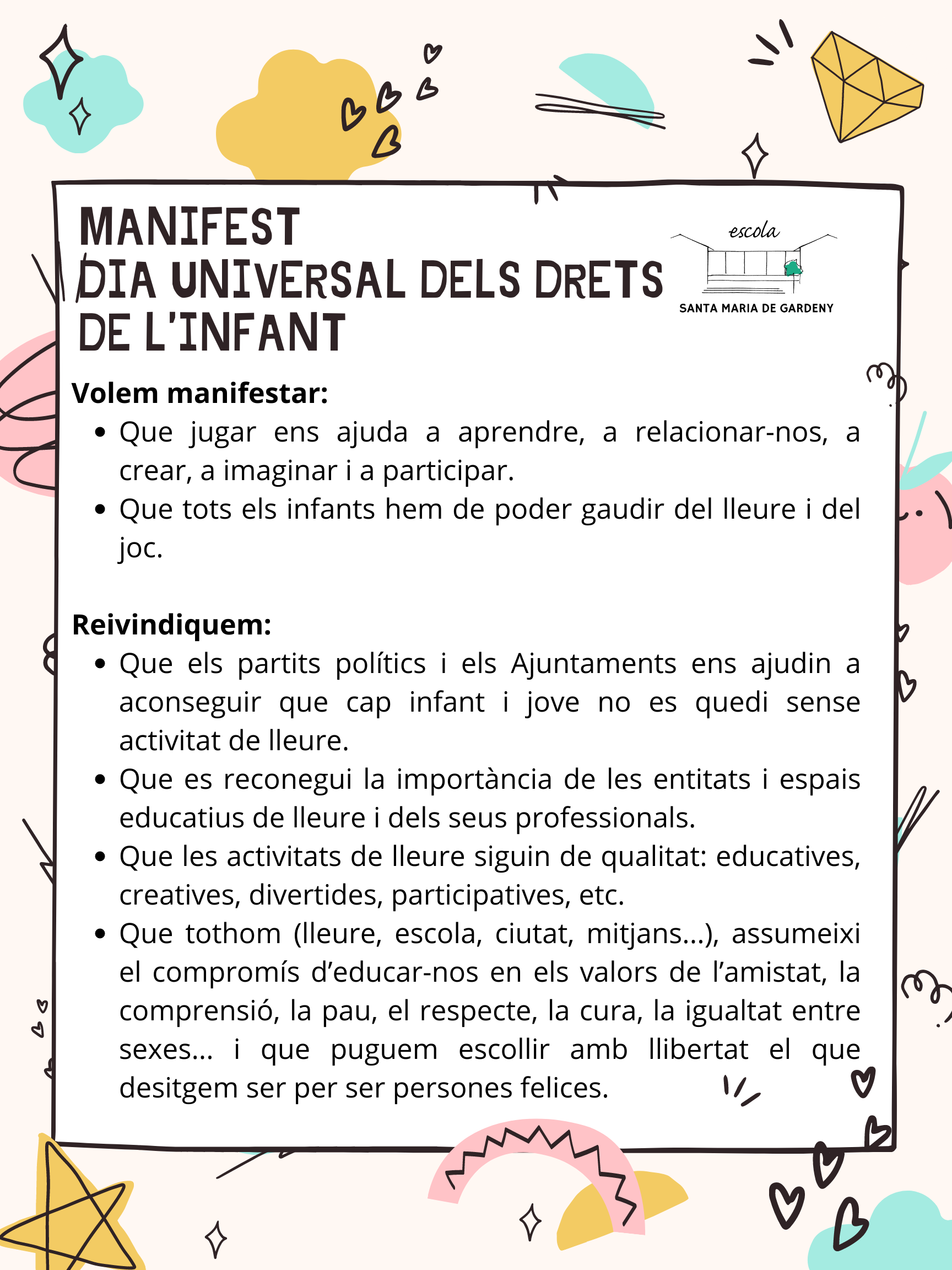 El 20 de novembre és el Dia Internacional dels Drets dels Infants i l’alumnat de cicle mitjà vam fer diferents activitats per poder-lo commemorar. Vam fer una manifest i una activitat on a partir d’unes paraules que teníem en un sobre, havíem d’anar triant durant el viatge que vam fer, les que ens semblarien més importants per quan arribéssim a terra.