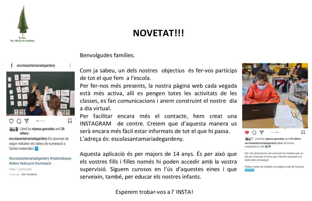 Ens podeu seguir a instagram! Feu un comentari / Per coordinació TAC / 2 de març de 2021 / Portada Com a novetat, ens podeu seguir a Instagram! Podeu seguir-nos a @escolasantamariadegardeny
