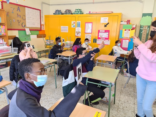 Cada alumne té una targeta amb un codi QR que serveix per respondre a les preguntes. La mestra amb l’app enfoca als alumnes i recull les respostes obtingudes.