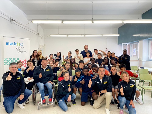 Els i les atletes, i el coordinador del projecte, Ramon Folguera, han fet una xerrada a l’alumnat de sisè sobre els valors a través de l’esport.