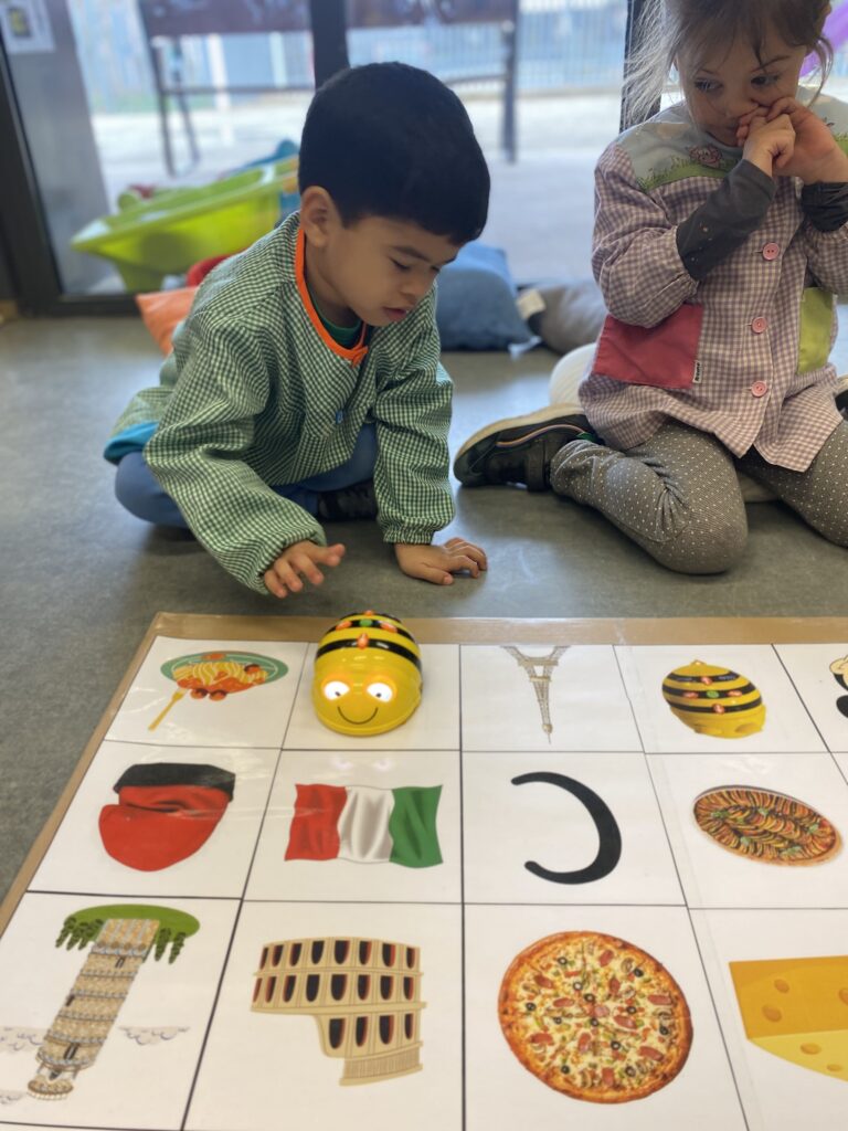 Tot alumnat d’infantil els Divendres després del pati, ens barregem per fer tallers. Aquest curs, continuem amb l’inici a la programació digital a través de la Robòtica, més concretament, amb la utilització de les BEE BOTS. Un robot en forma d’abella, que es programa a través d’uns botons, donant-li unes indicacions per tal de fer-la arribar fins allà on volem. A través d’aquesta eina digital, treballem la lateralitat, l’inici a la programació i posem en èmfasi els diferents continguts i vocabulari en relació al projecte: FENT CAMÍ PEL MÓN! Les mestres vam crear una catifa amb cartró i vam enganxar imatges simbòliques en relació als diferents països als quals pertanyen els nens i nenes d’infantil ( Infantil 3 anys Catalunya, Infantil 4 anys França i infantil 5 anys Itàlia) i a través de les BEE BOTS, hem pogut recordar els conceptes treballats en relació al nostre país: els colors de la bandera, les tradicions i costums, menjars típics, vestuari, etc.