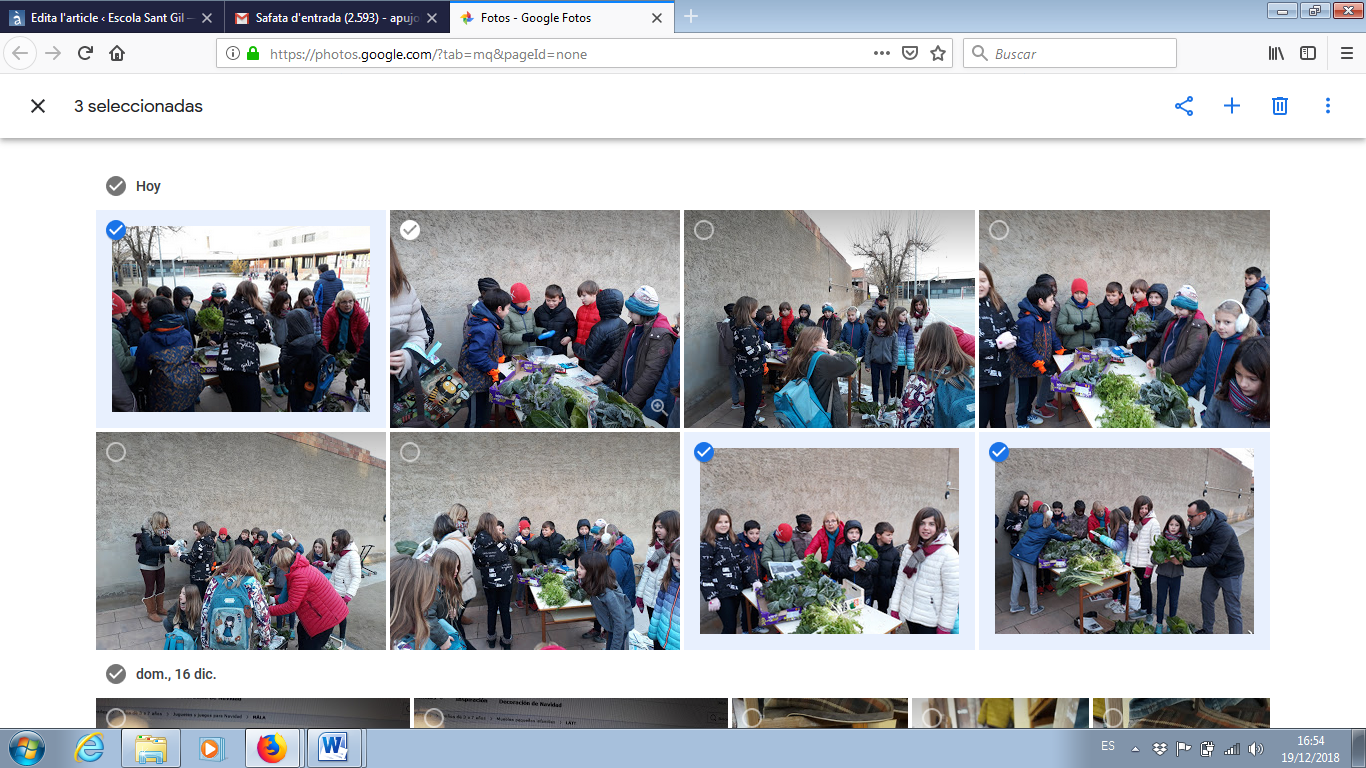 Amb un fred que pelava, tot l’alumnat amb l’ajut de la nostra incasable Josefina, ha collit enciams, escaroles, espinacs i algunes cols. LLàstima que el gel les havia malmés una mica, però totes les famílies han comprat igualment i s’ ha fet cap a 37€ de calaix. Donem les gràcies també als pares que ens han ajudat a muntar la parada.