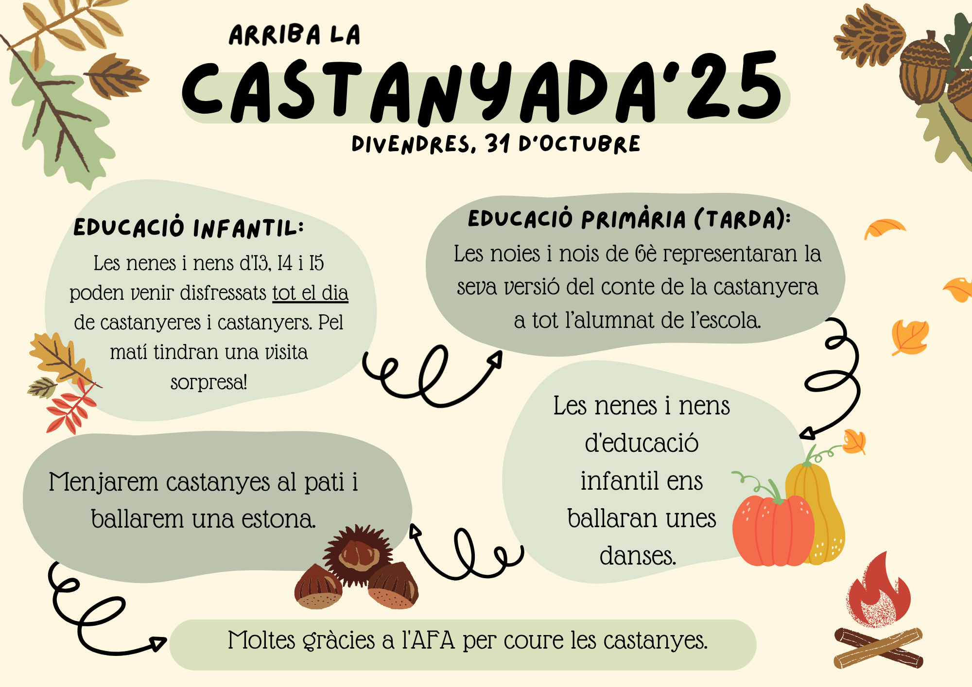 El passat divendres 31 d’octubre vam celebrar la castanyada a l’escola amb les següents activitats: