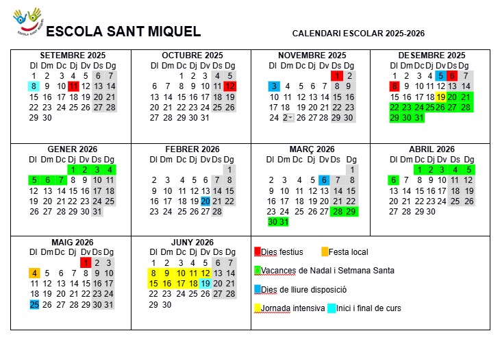 L’horari de la jornada intensiva és 9 a 13h. (Els alumnes que utilitzen el servei de menjador surten a les 15:30h.)