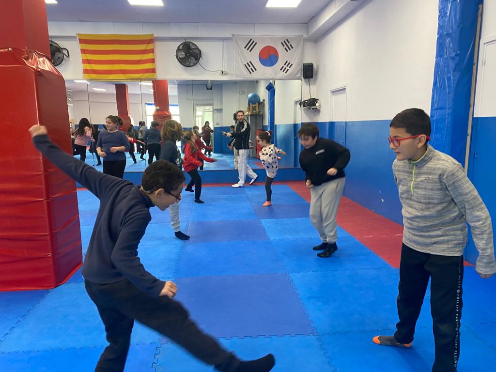 5è hem gaudit de la segona sessió de taekwondo al gimnàs Seül. A l’entrenament, no només potenciem la nostra força i destresa, també hem practicat exercicis per desenvolupar la flexibilitat, la velocitat i la coordinació dels moviments. És una disciplina molt tècnica, ens ajuda a aprendre a conèixer i controlar el nostre cos. És un entrenament molt complet que ens ha encantat.