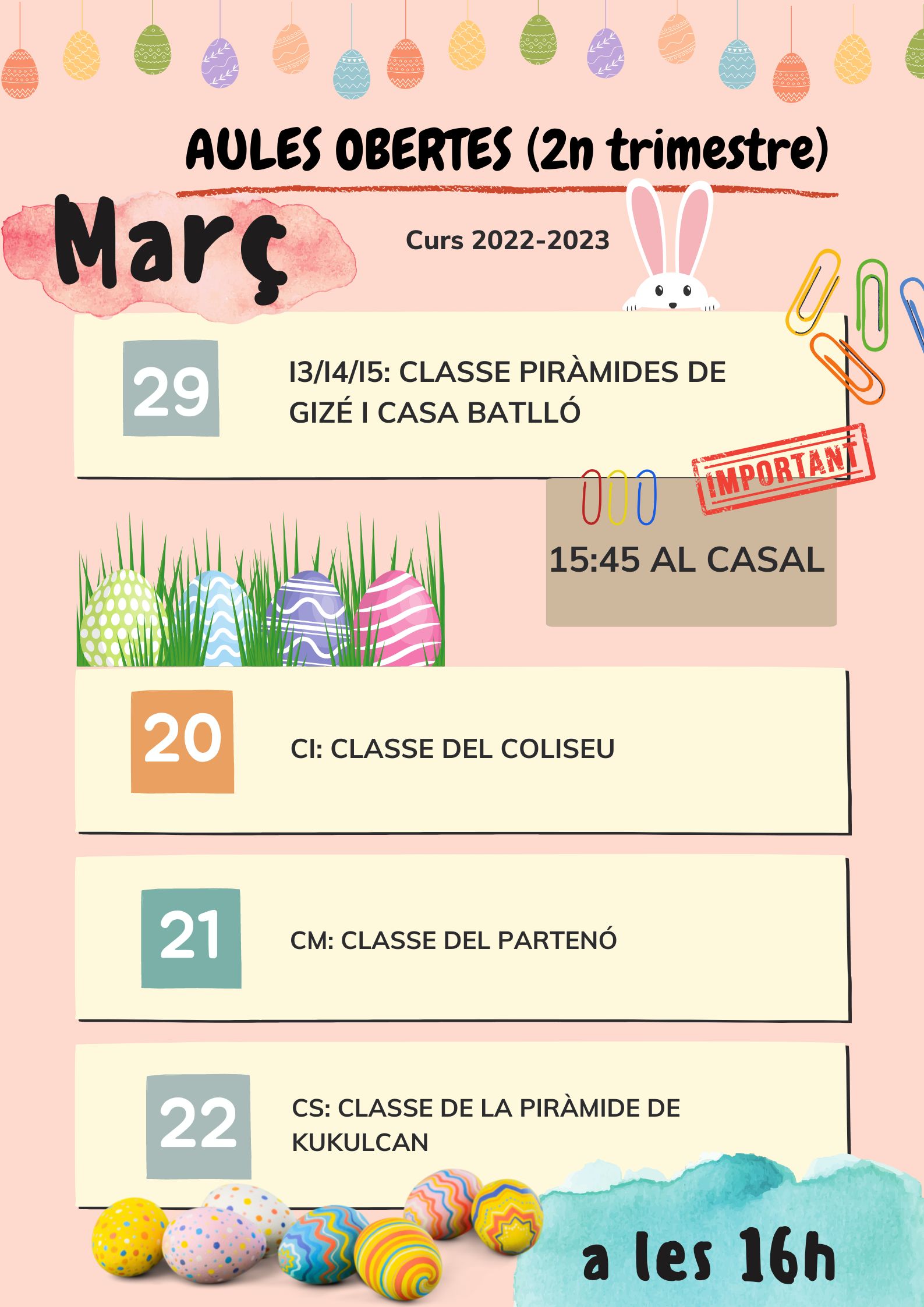 AULES OBERTES DEL SEGON TRIMESTRE Feu un comentari / Per admin / 14 de març de 2023 / Infantil Portada Primària Atenció famílies! La setmana que ve tornem a celebrar les aules obertes a l’escola. Pares, mares, avis, tiets, germans… Tots hi sou convidats a l’aula del vostres fills! Alerta, la d’infantil serà el 29 a les 15.45 directament al casal.