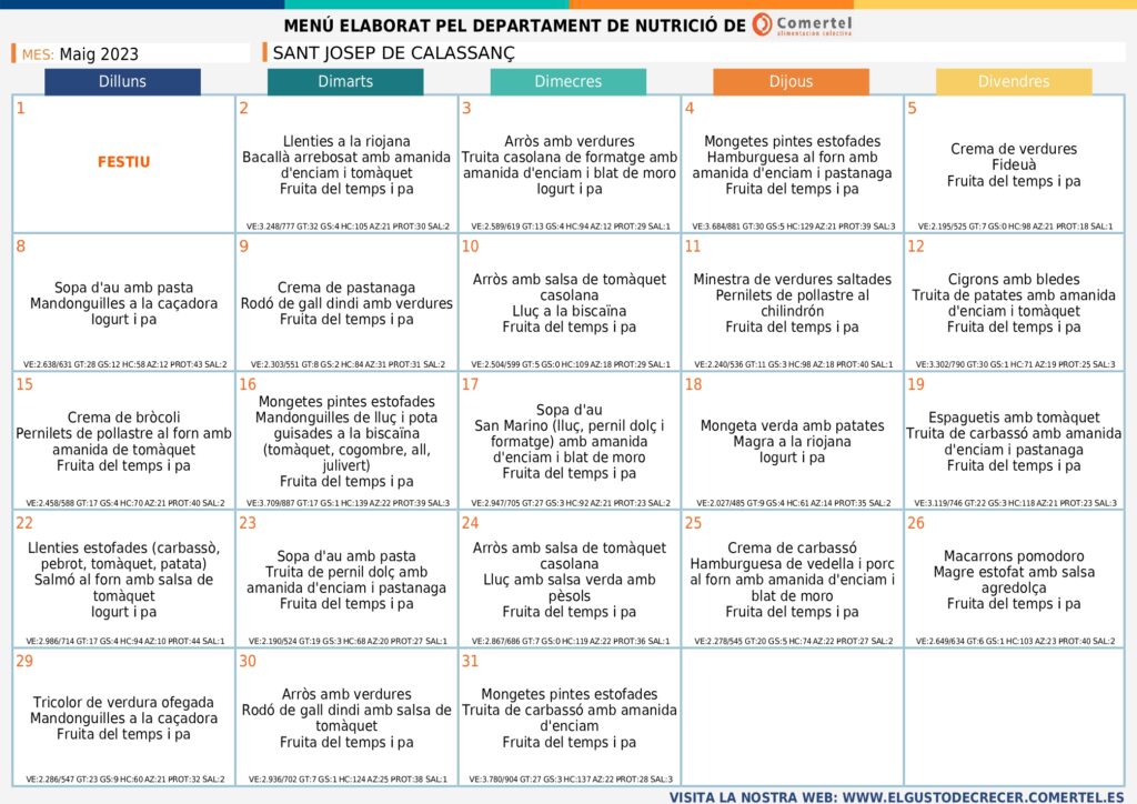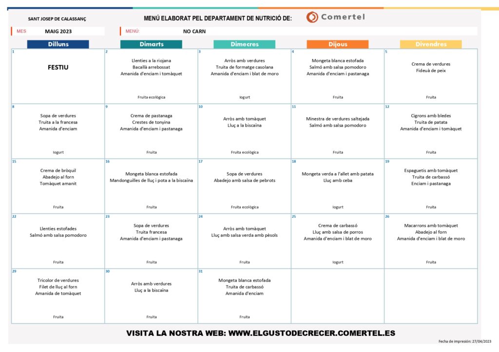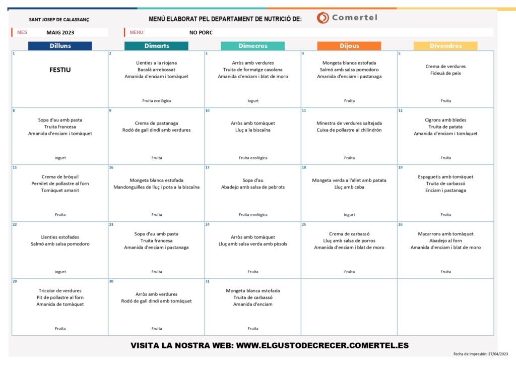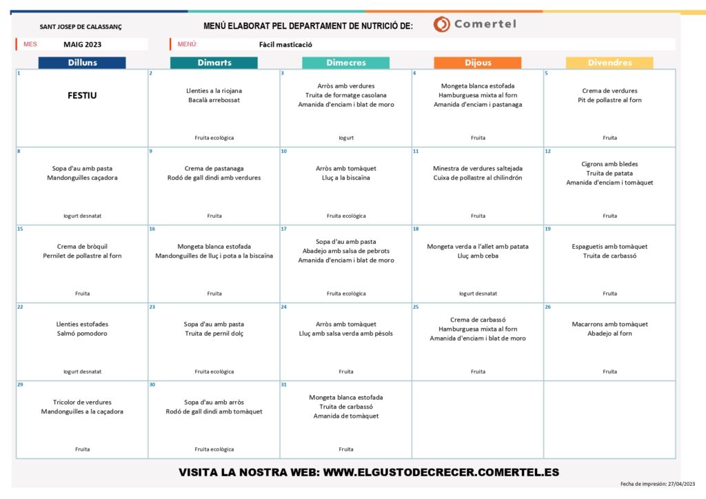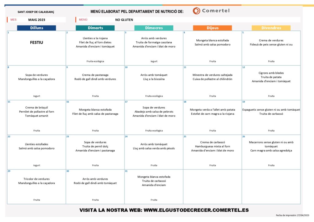 MENÚS MENJADOR MAIG admin02/05/23 MENÚ BASAL MENÚ NO CARN MENÚ NO PORC MENÚ SENSE LACTOSA MENÚ SENSE GLUTEN MENÚ FÀCIL MASTICACIÓ