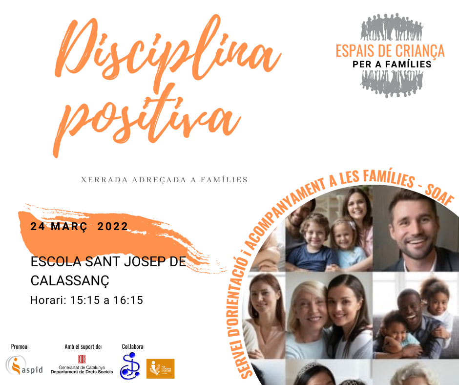 El dijous 24 de març, a les 15:15 h fins a les 16:15 h, no us podeu perdre la xerrada adreçada a les famílies sobre “Disciplina positiva”. Tindrà lloc a la nostra escola. Qualsevol dubte poseu-vos en contacte amb nosaltres.
