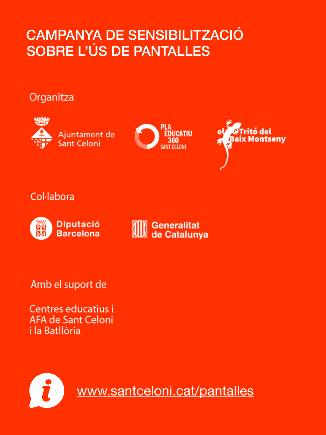 L’Ajuntament de Sant Celoni, conjuntament amb el Pla de Prevenció de les Addiccions del Baix Montseny, El Tritó, i amb el suport del Centre de Recursos Pedagògics del Departament d’Educació de la Generalitat de Catalunya, així com amb la implicació i complicitat de tots els centres educatius i les AFA del municipi, impulsa una campanya de sensibilització sobre l’ús de les pantalles.