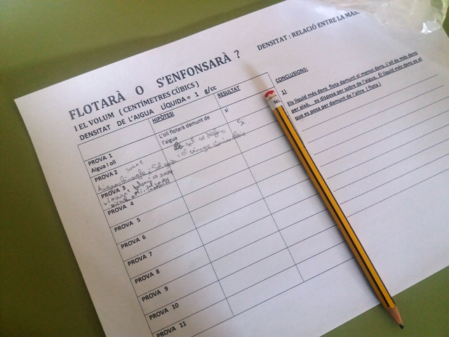 La densitat es la relació entre la massa (gr) i el volum ( c.c.)que té una matèria. Quan barregem líquids i/o sòlids  els més dens on es disposa, a dalt o a baix?  Hem fet les nostres hipòtesis i n’hem extret les nostres conclusions, reafirmades a partir de proves .