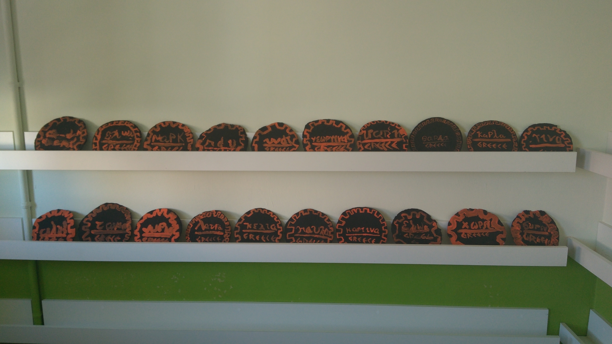 L’alumnat de 5è va dissenyar amb pasta de modelatge plats decoratius recreant la ceràmica típica de l’antiga Grècia. Per fer-ho, van fer servir els colors típics emprats per aquesta civilització així com els motius característics de la mateixa (motiu/marc decoratiu). A més, cada alumne i alumna va pintar el seu nom amb l’alfabet grec. Com que s’havien d’exposar, també es van fer dos murals amb el mateix estil. La classe va ser dividida en dos grups, on cadascú es va encarregar de les paraules “ANCIENT” i “GREECE” (antiga Grècia) amb lletres de tipus hel·lenístic.
