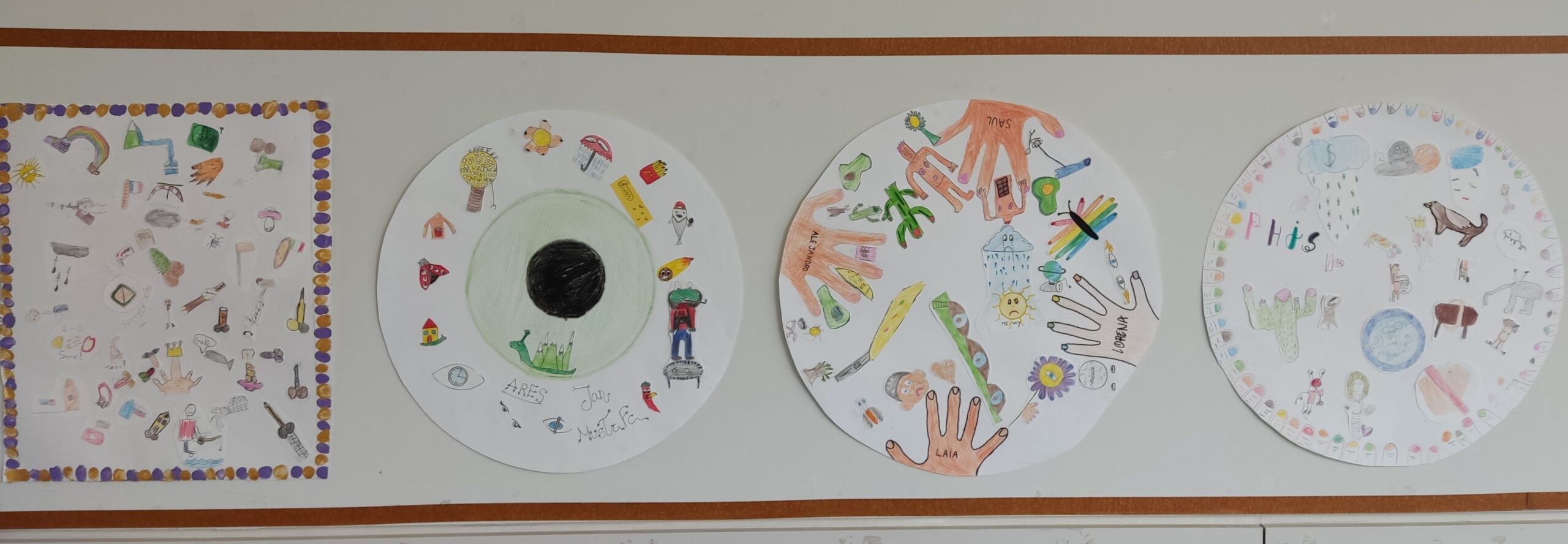 Per grups, ens havíem d’inventar uns dibuixos surrealistes, relacionats amb el cos humà. Després, aquests dibuixos retallats, els havíem de col·locar dins d’unes formes, que podien ser: rodones, quadrades o triangulars. El meu grup vam escollir la rodona, per simbolitzar el nostre món particular.