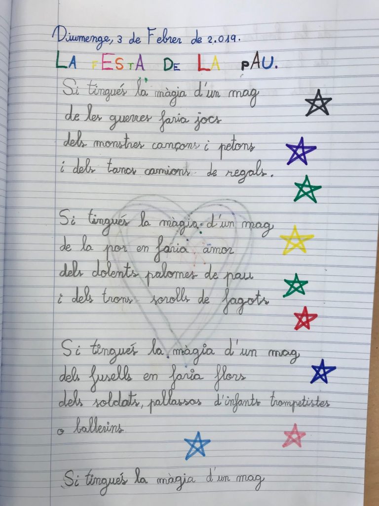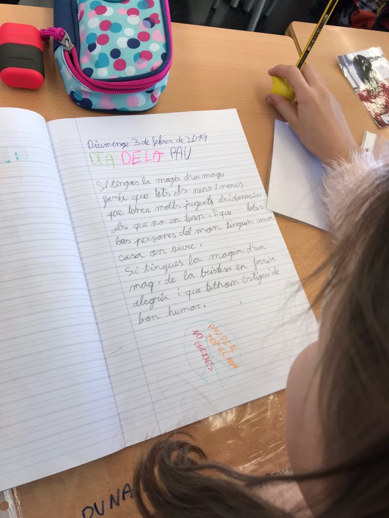 A tercer curs, aprofitant el dia mundial per a la Pau, vam escriure poemes per la pau intentat ser per un dia mags i creant els nostres desitjos per aconseguir que no hi hagi més desigualtats ni guerres. Aquí us deixem les exposicions que vam fer a als nostres companys i companyes dels nostres menuts però grans poemes. Som uns grans artistes!