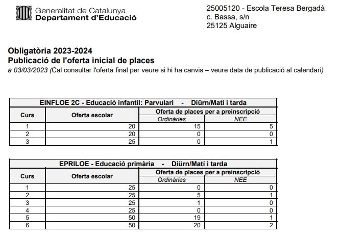 - Presentació i/o modificació de sol·licituds Educació infantil de segon cicle i educació primària: del 6 al 20 de març de 2023