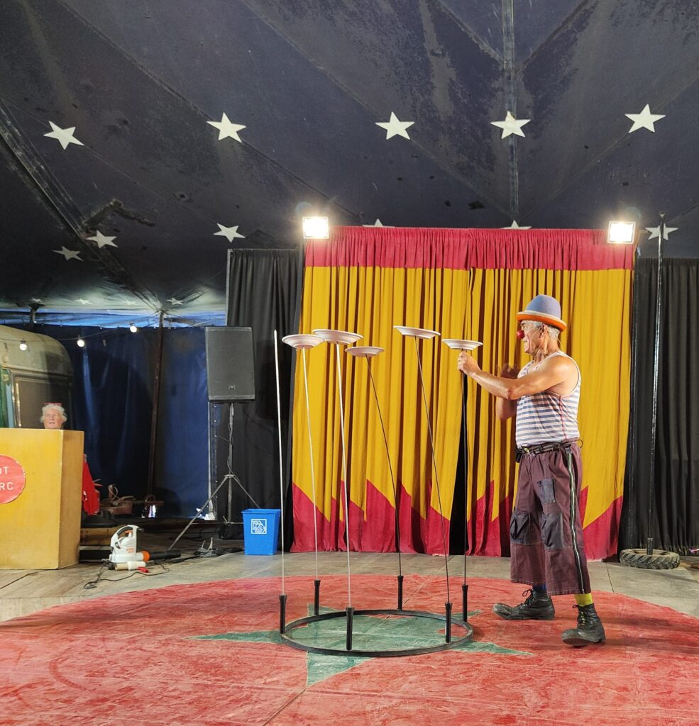 Sense perdre un minut vam iniciar el “Taller de Circ”, adaptat a les edats dels nens i nenes. Tots es van sentir protagonistes d’un espectacle al seu abast. Les propostes es van convertir en un toca-toca de tot el material, per anar resolent els petits reptes plens de color i moviment, tant a l’interior com a l’exterior de la carpa. Maroma d’equilibri, xanques de mà, hola-hops gegants, rodets d’equilibris, monocicles i rodetes, malabars de tot tipus (diàbolos, bitlles, plats xinesos, pals de l’infern, …), saltabrinques, mini-tramps i maquillatge, amb barret inclòs, per gaudir del dia amb alegria.