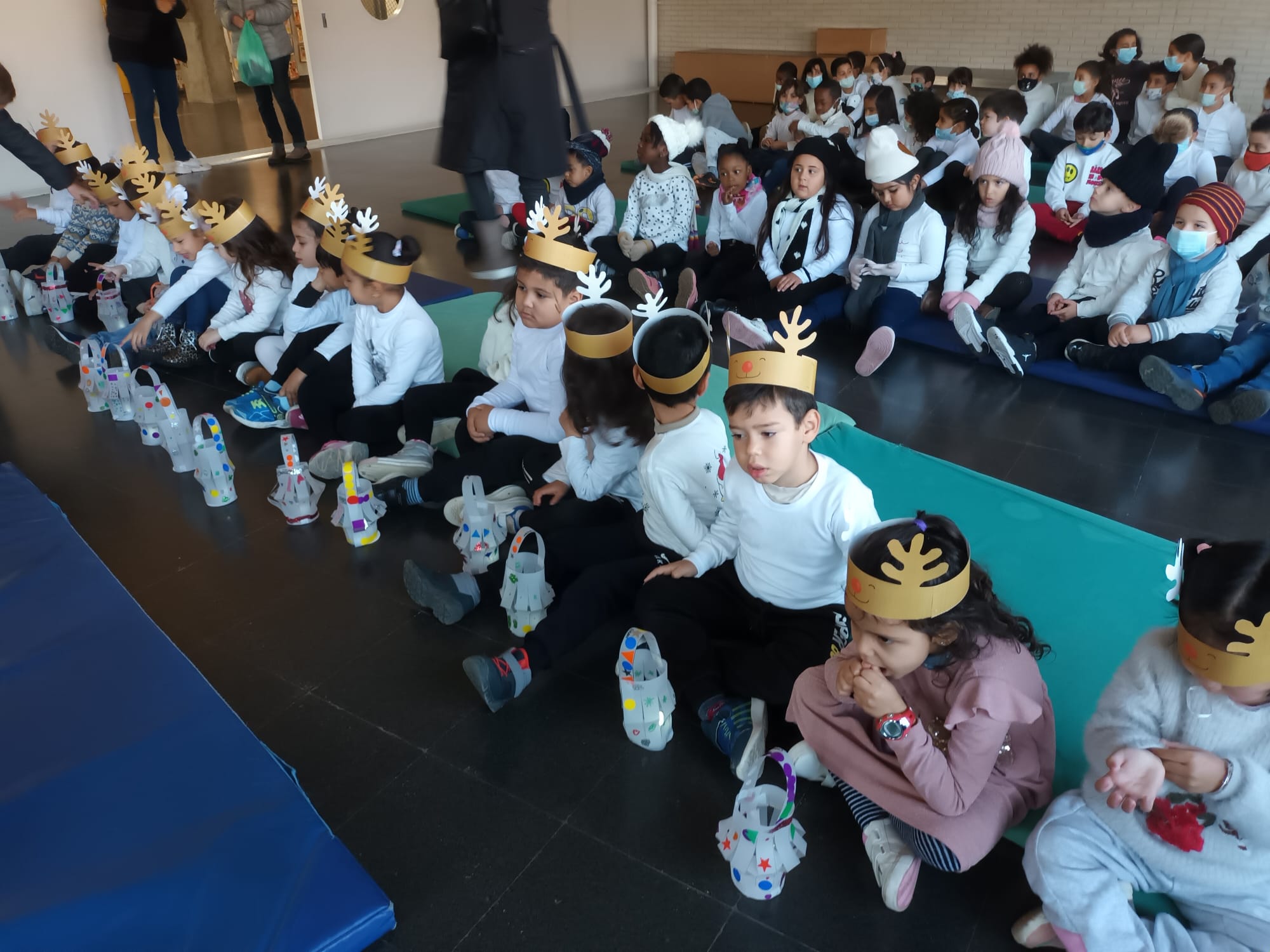 El Tió va arribar al pati de la nostra escola i tots nosaltres el vam anar a buscar. El vam portar al passadís d’Infantil perquè no passés fred i perquè tots els nens i nenes li poguessin donar menjar.