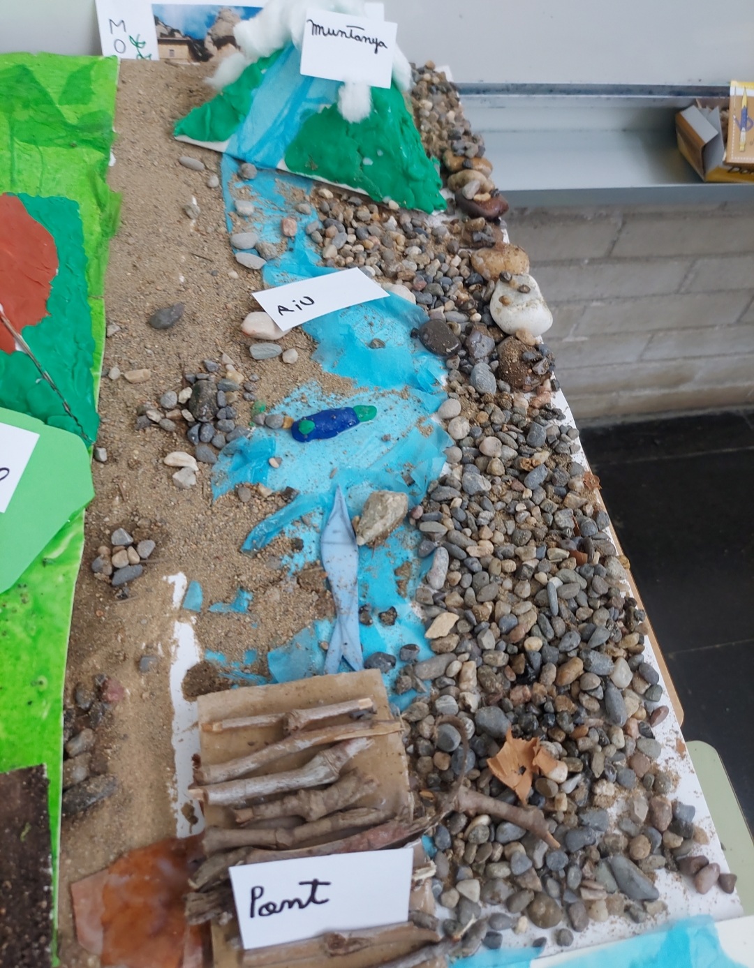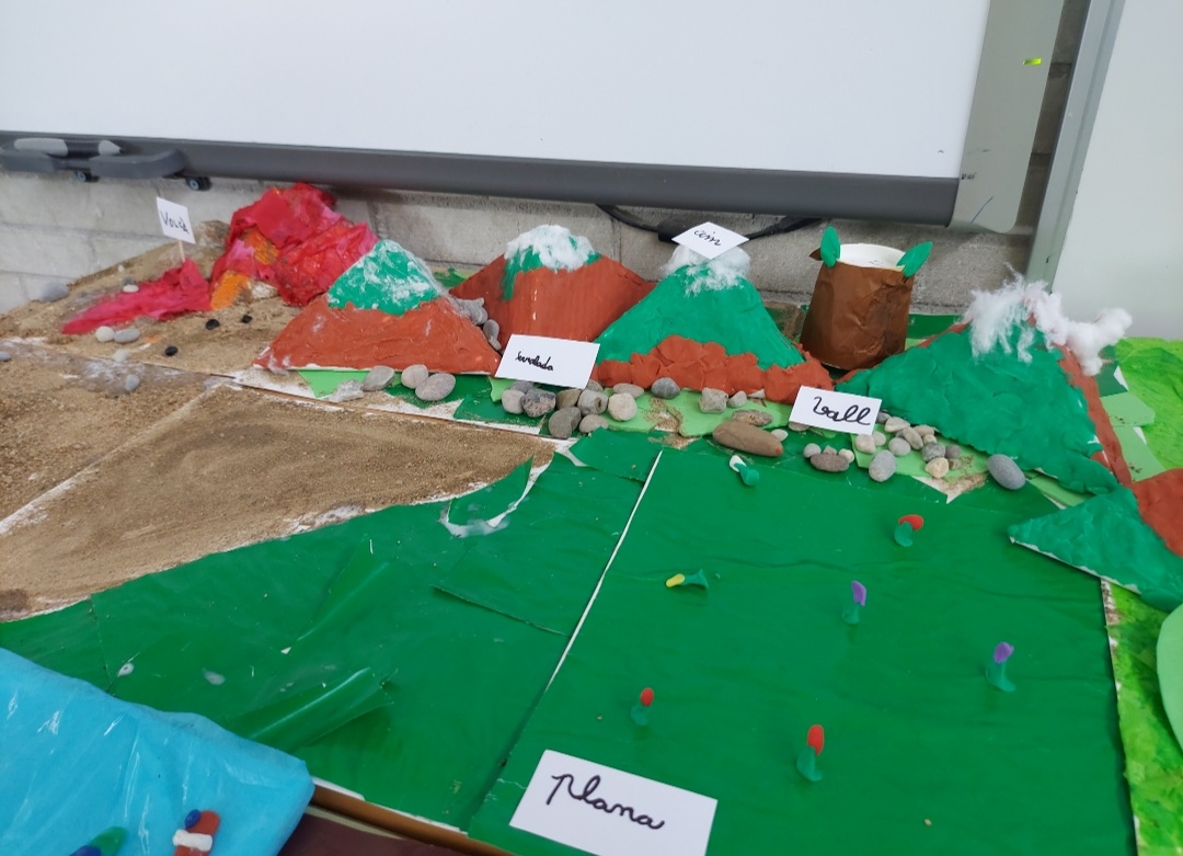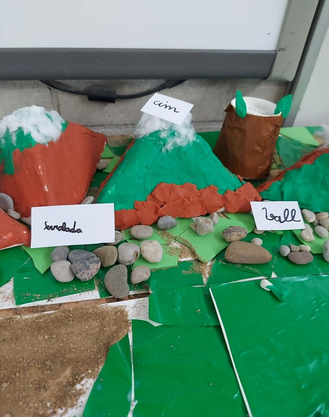 Primer hem vist fotos de paisatges i hem fet una pluja d’idees sobre les coses que vèiem. La Miriam i la Bea ens han ensenyat algunes paraules de vocabulari que no coneixiem i tots junts hem fet una gran llista. Hem parlat sobre les muntanyes, les serres, els rius, els penya-segats… i ens han sortit dues preguntes que haviat començarem a investigar: