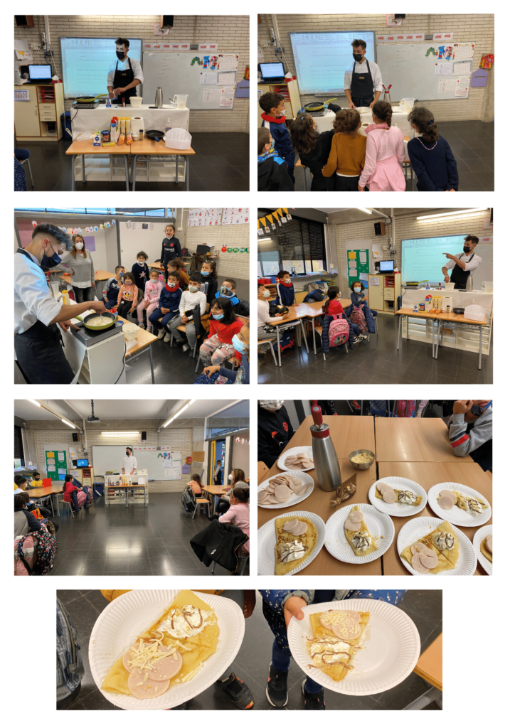 Després ens ha preparat un taller de cuina. Hem vist en directe la preparació de creps! Quins ingredients ha fet servir, els estris de cuina… fins i tot ens ha portat un sifó per fer la nata. Mai havíem vist això!