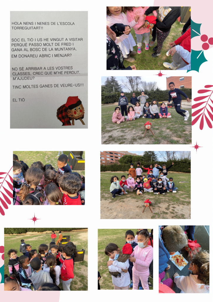 Arriba el Tió! Escola Torreguitart10/12/21 Avui ens ha arribat una carta molt especial a la classe de les Formigues i dels i les Xefs! Ha arribat el Tió i hem sortit a buscar-lo per l’escola. Ha estat molt divertit, ens estava esperant al tren del pati. Ens cagarà alguna cosa? De moment li estem donant de menjar… Toca esperar!!