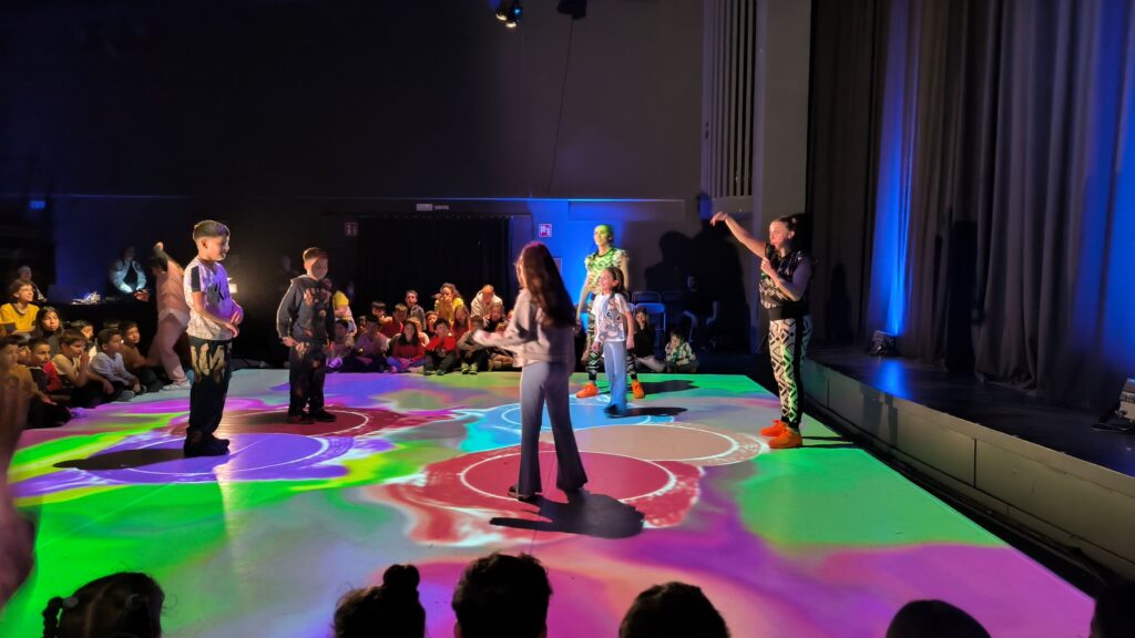 Aquest espectacle ens va transportar a l’univers del Hip Hop, un món ple de ritmes, música i moviment que ens va fer ballar des del primer moment. A través dels personatges de la Hip i la Hop, vam viure un viatge participatiu i divertit, on vam poder descobrir diferents elements d’aquesta cultura tan rica.