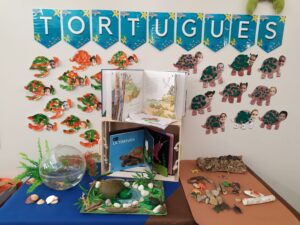Hem decorat la porta de la classe per a què tothom sàpiga com ens diem i hem fet un racó amb diferents coses de tortugues que anem ampliant a mida anem treballant el tema.